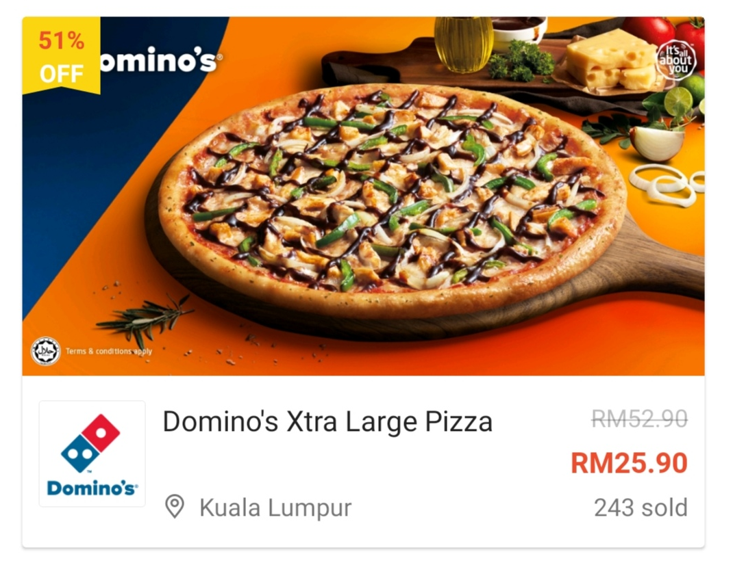 ⑥ 1份Domino’s Xtra Large Pizza —— 只需RM25.90(原价RM52.90)