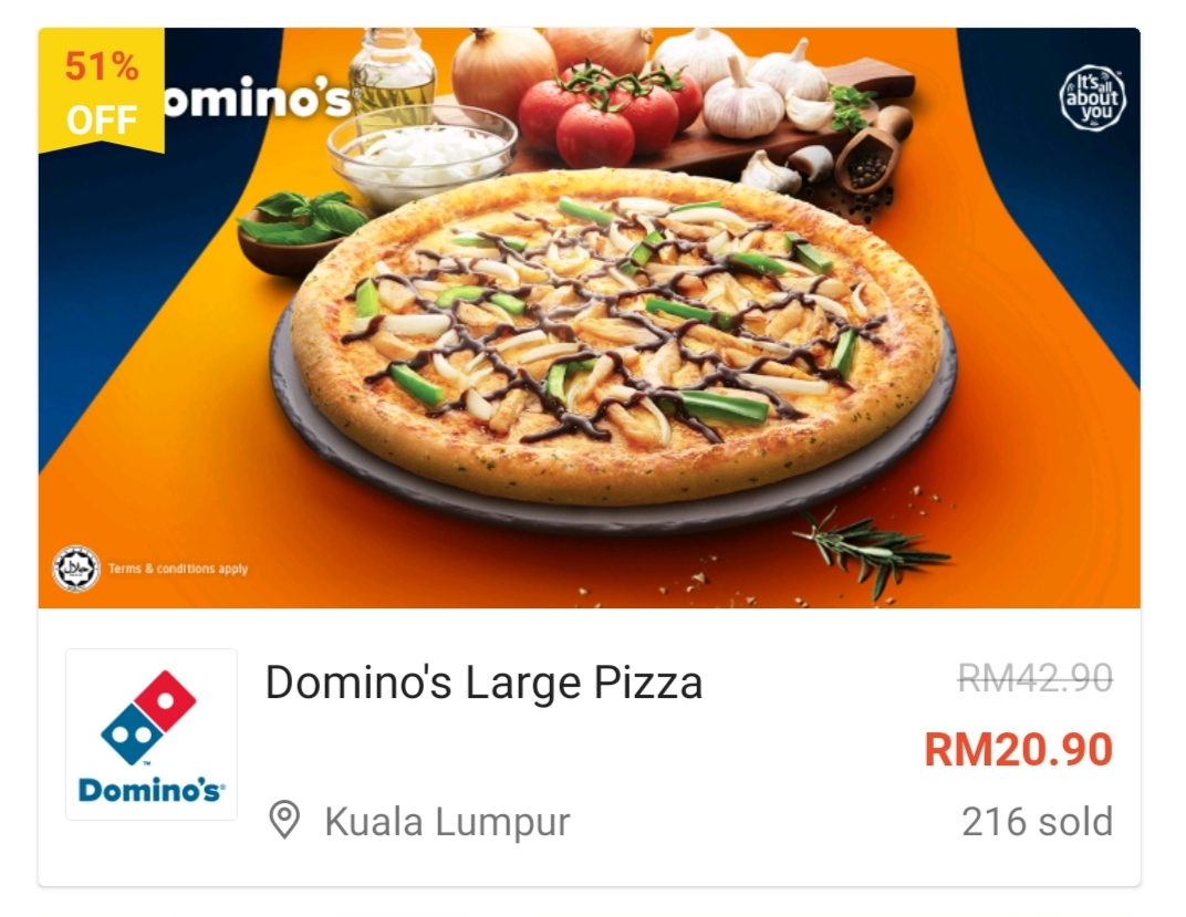 ⑦ 1份Domino’s Large Pizza —— 只需RM20.90(原价RM42.90)