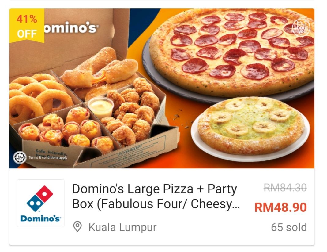 ⑩ Domino’s Large Pizza + Party Box(Fabulous Four/Cheesy Four) + Banana Kaya 6″ —— 只需RM48.90(原价RM84.30)