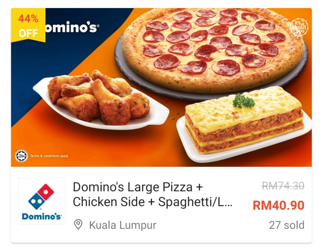 ⑫ Domino’s Large Pizza + Chicken Side + Spaghetti/Lasagna ——只需RM40.90(原价RM74.30)
