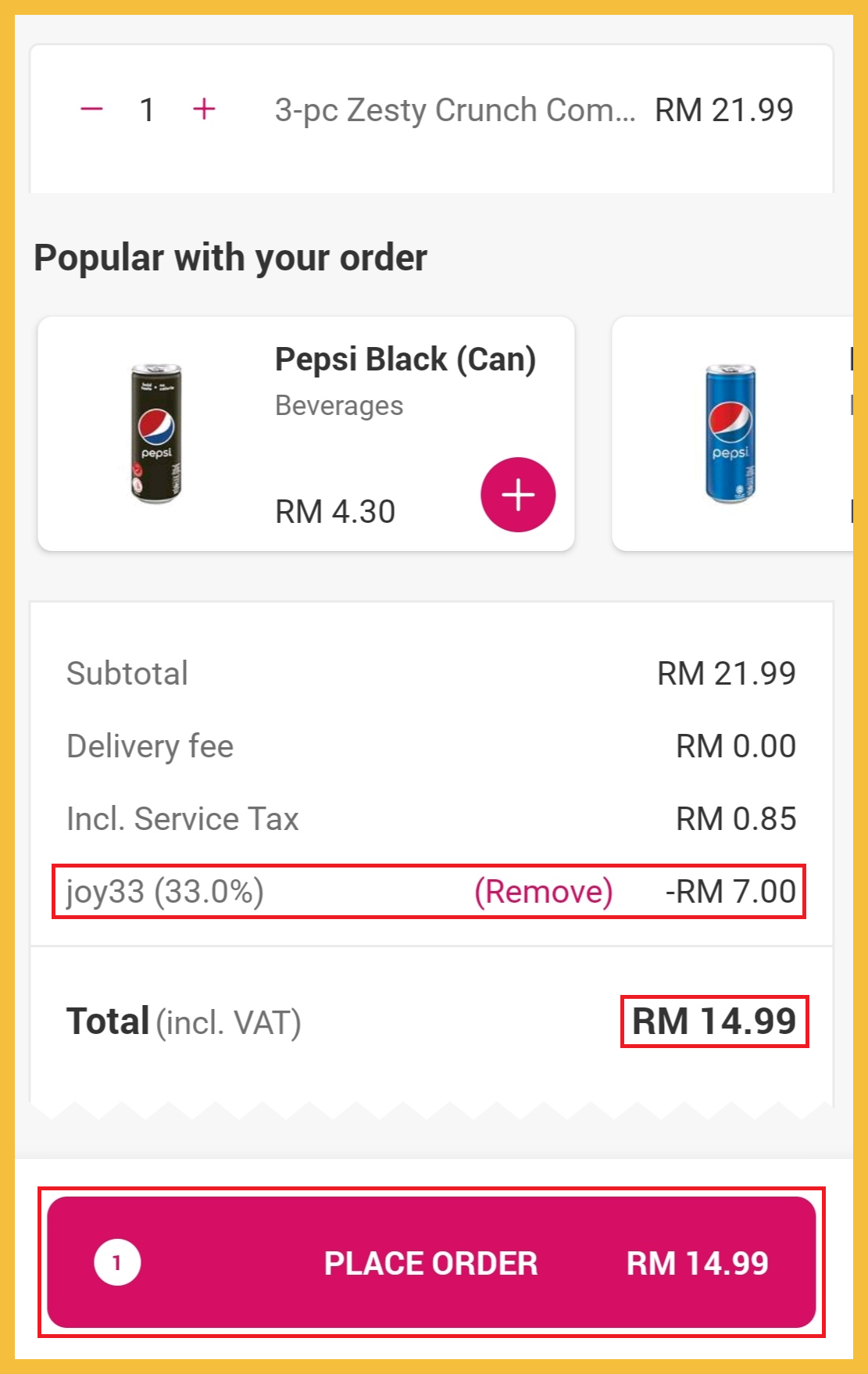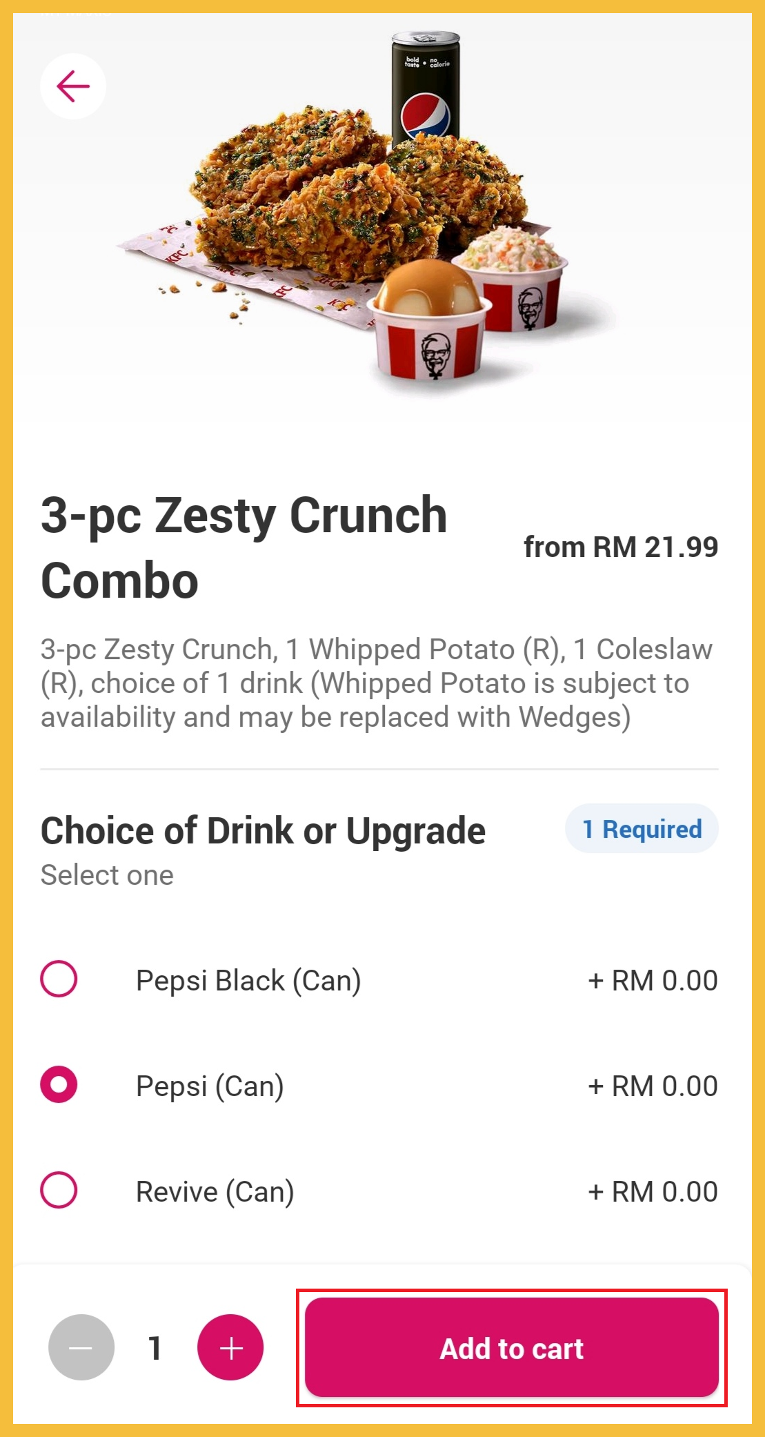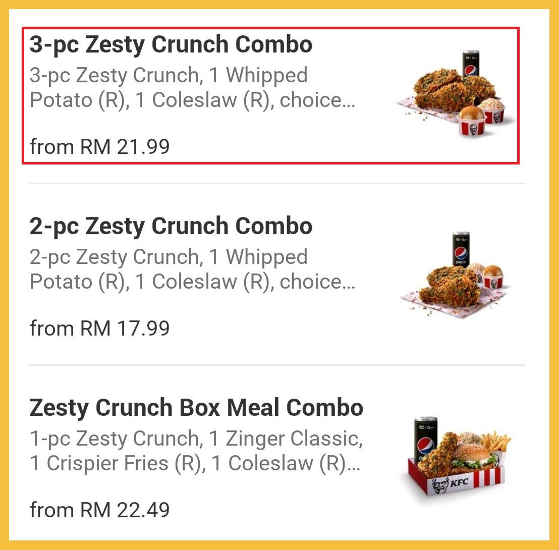 ※ 一份3-pc Zesty Crunch Combo(原价RM21.99),折扣【JOY33】优惠码后只需RM14.99!