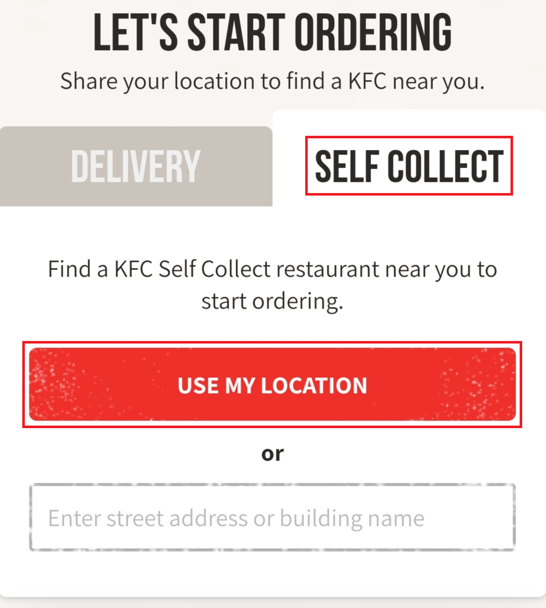 步骤1:打开你的KFC APP,选择Self-Collect 或Delivery 服务。(小编选择Self-Collect)
