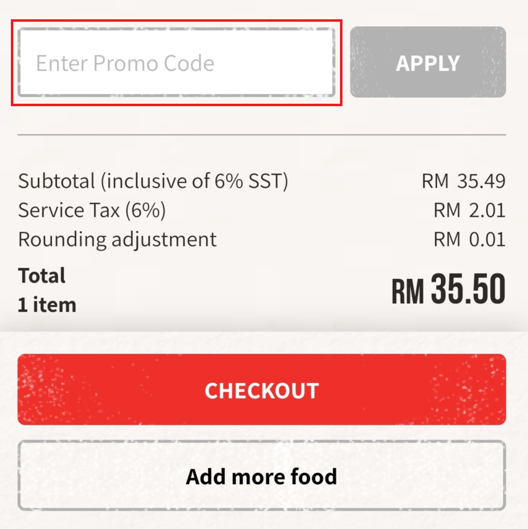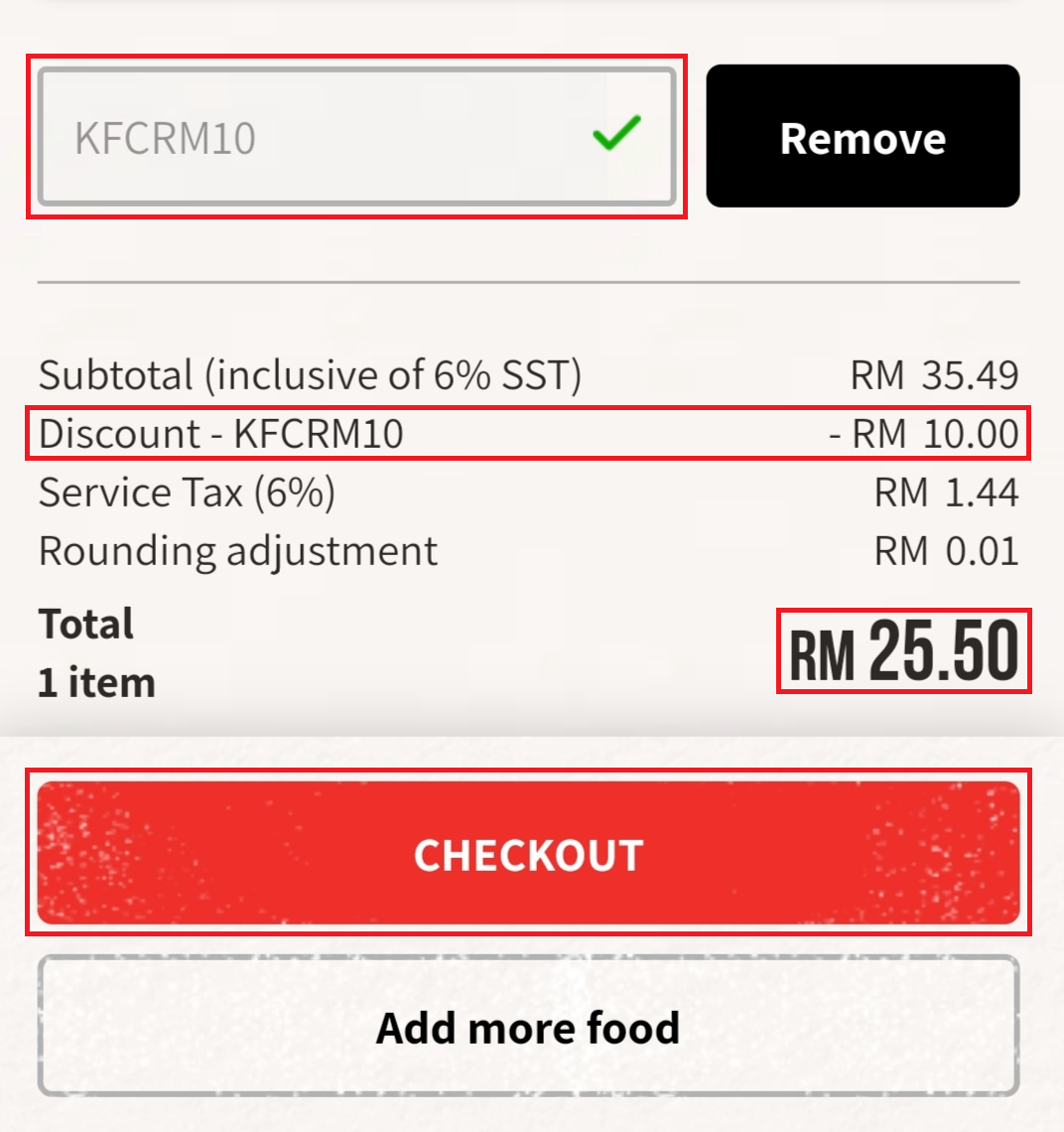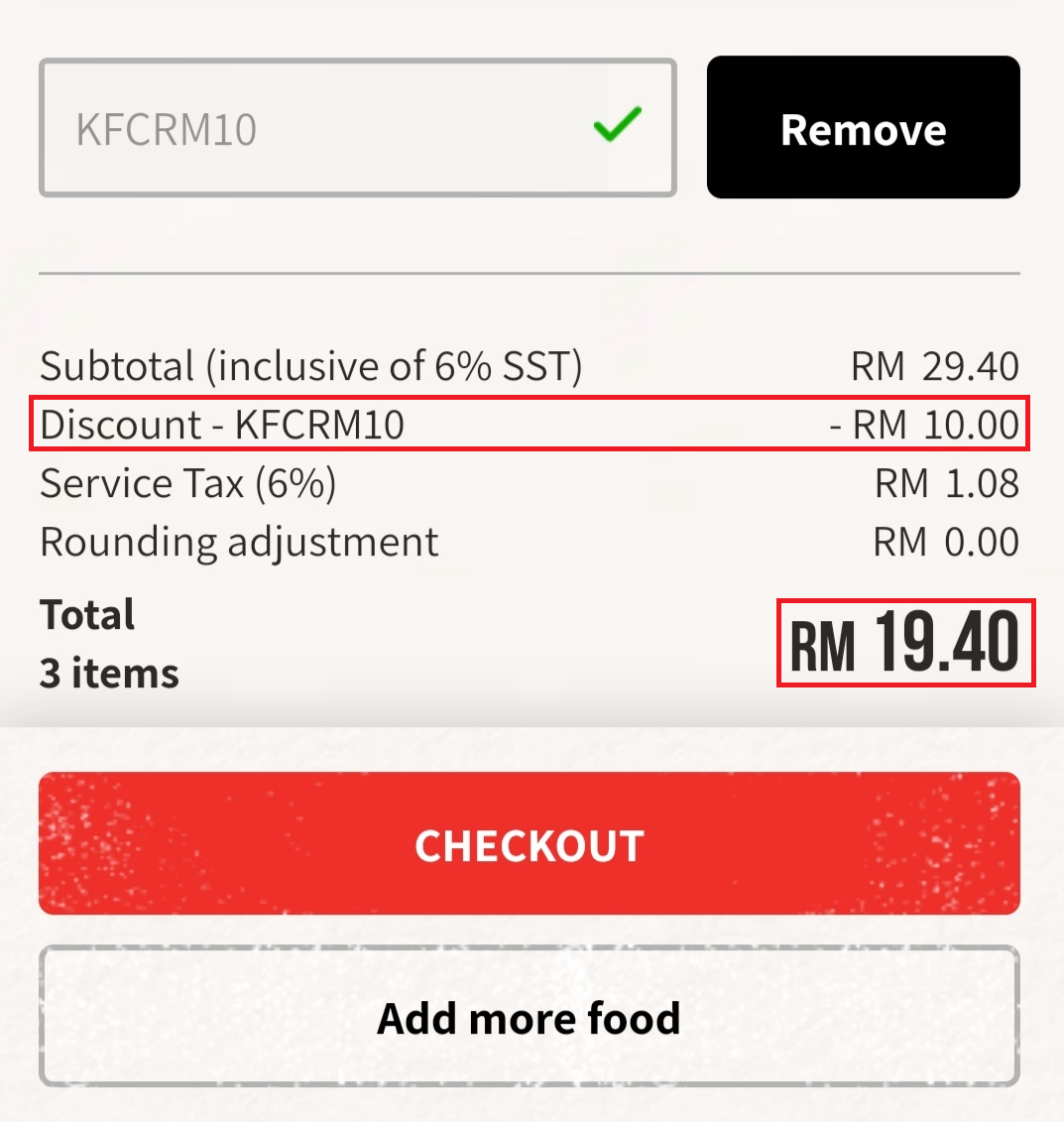 步骤5:输入优惠代码【KFCRM10】可获得RM10折扣。