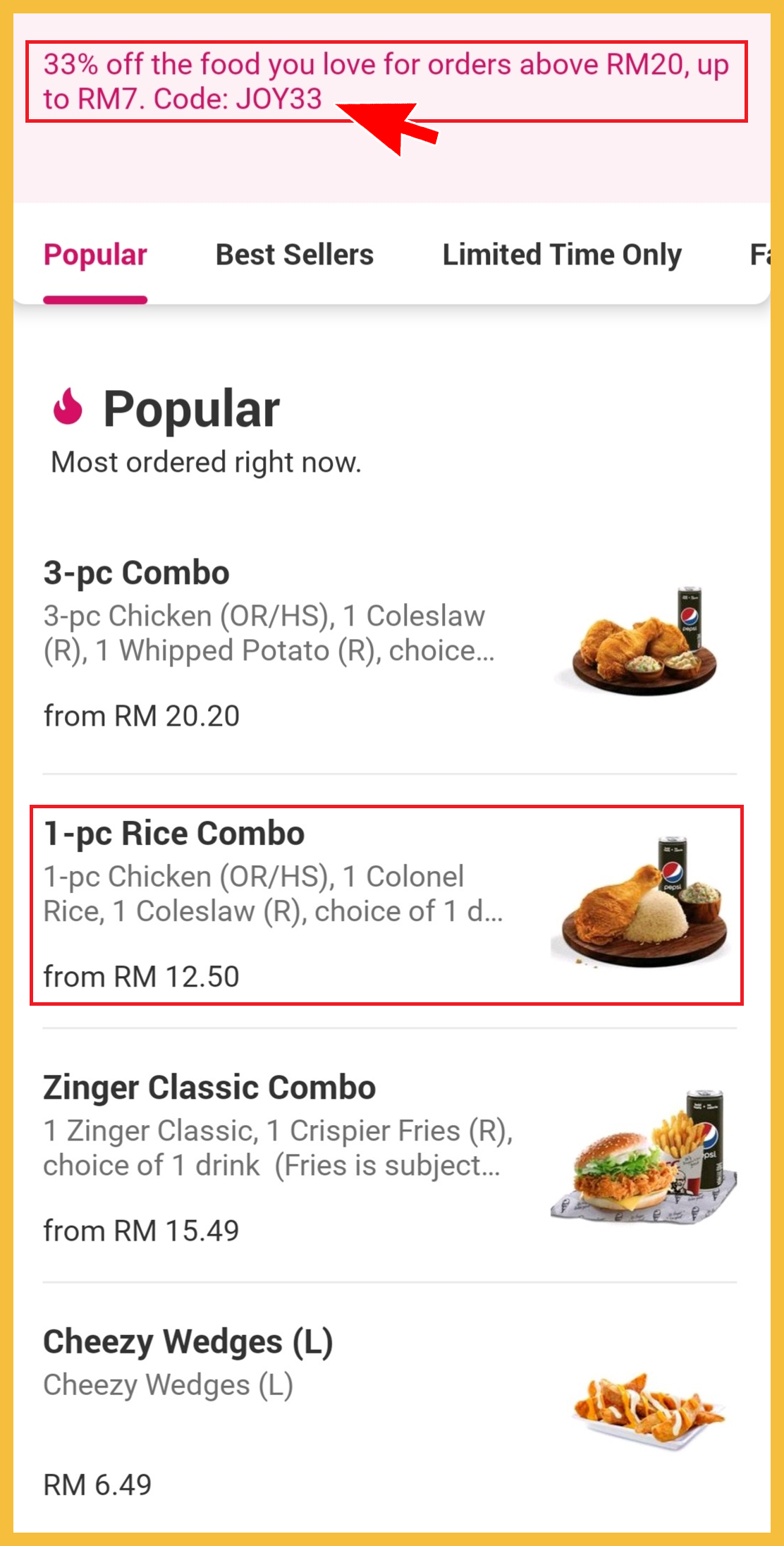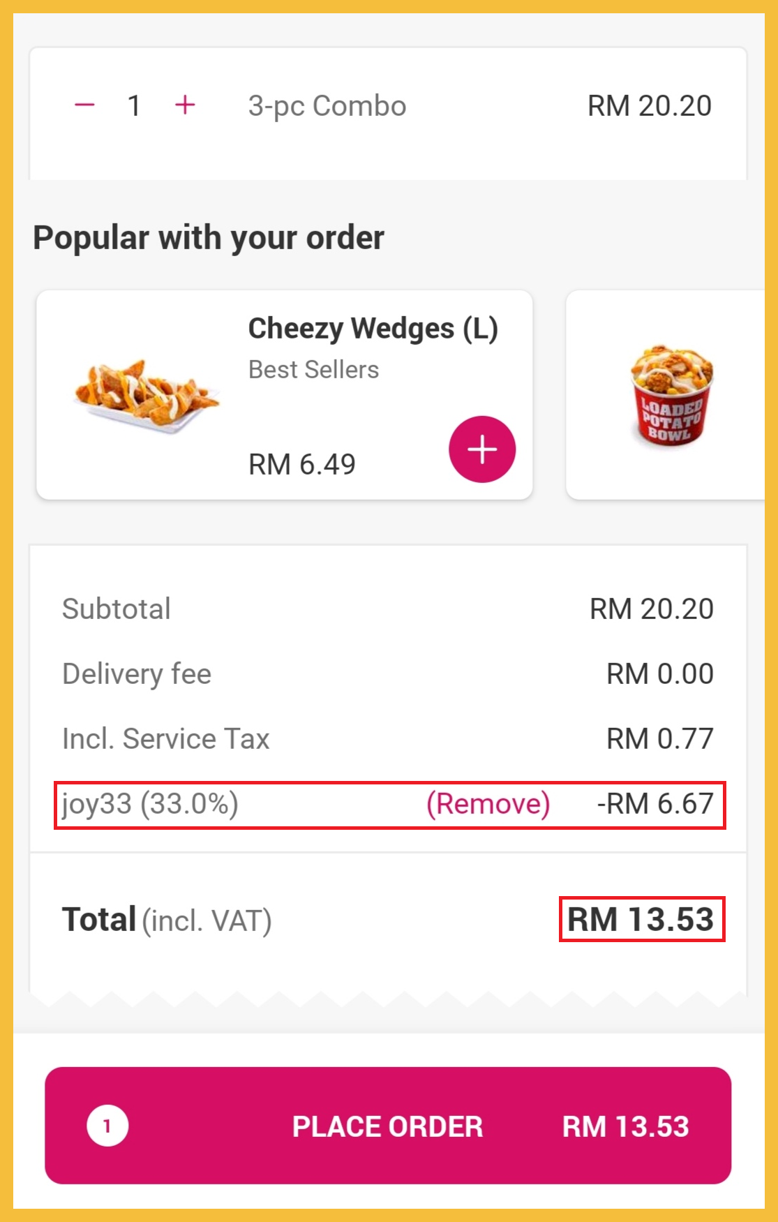 ▼ 一份3-pc Combo 套餐(原价RM20.20),折扣【JOY33】优惠码后只需RM13.53!