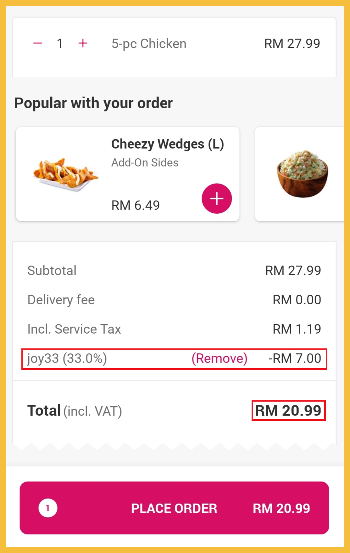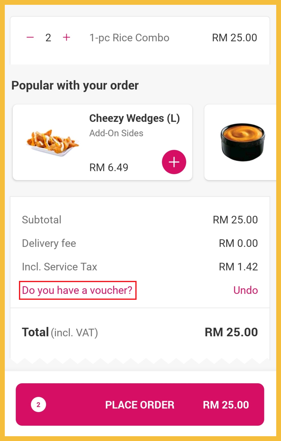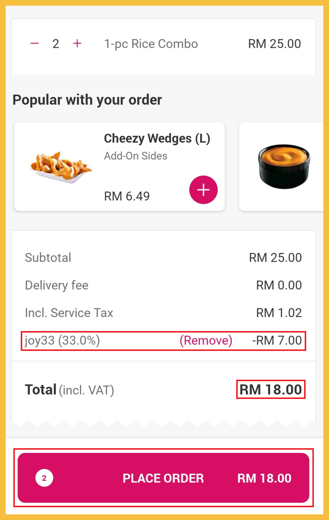 ※ 为了要达到RM20 折扣RM7此优惠!所以小编购买2份1pc Rice Combo(原价RM25),折扣【JOY33】优惠码后只需RM18,平均一份只需RM9!