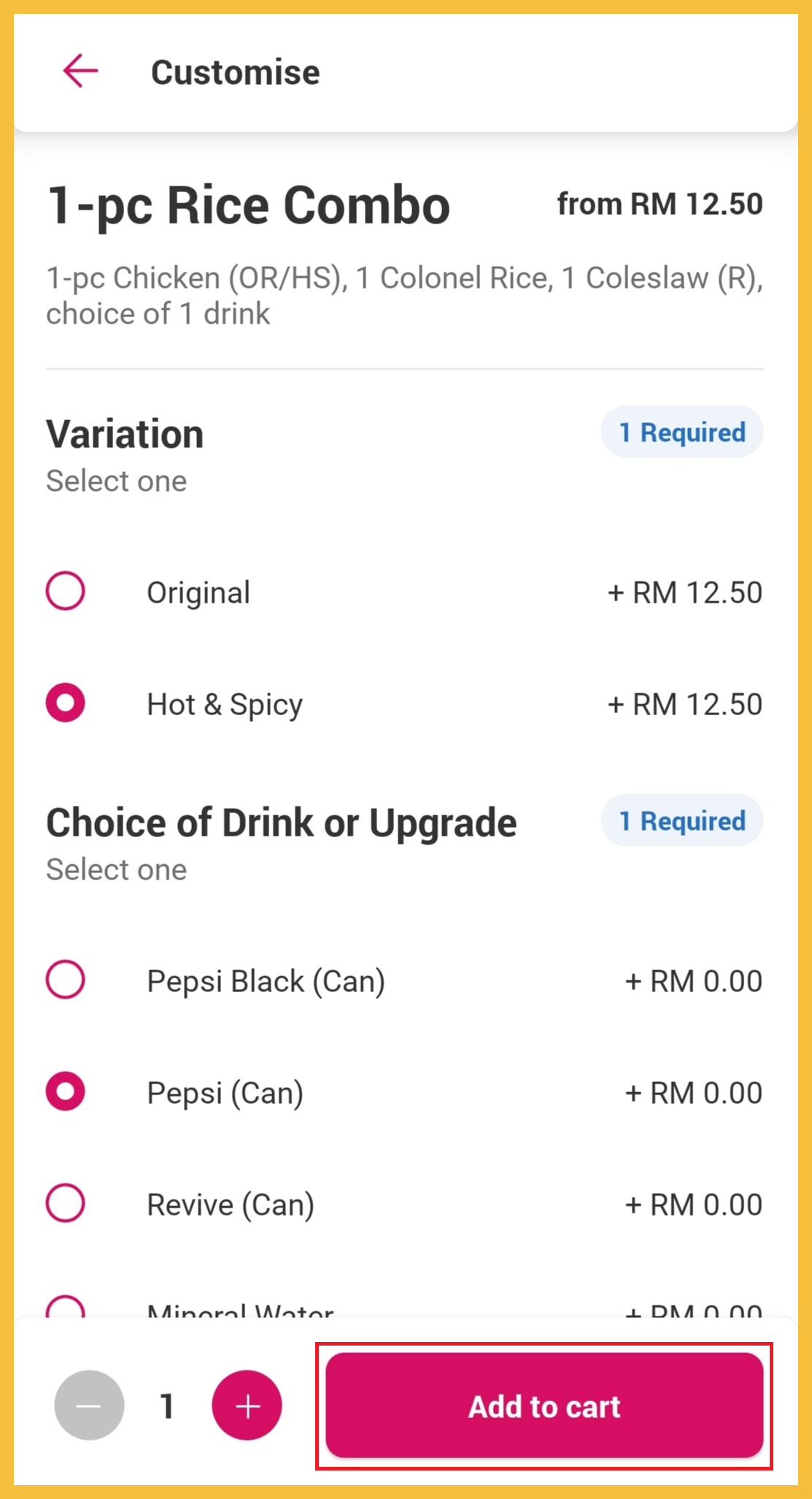 步骤2:选择你美食或套餐,例如:1-pc Rice Combo!