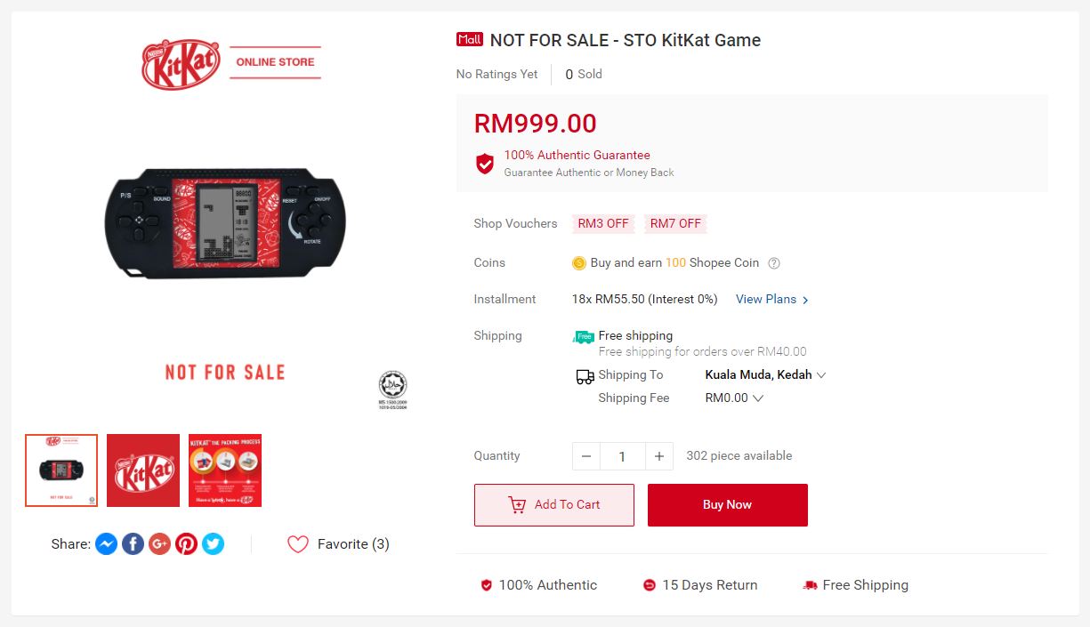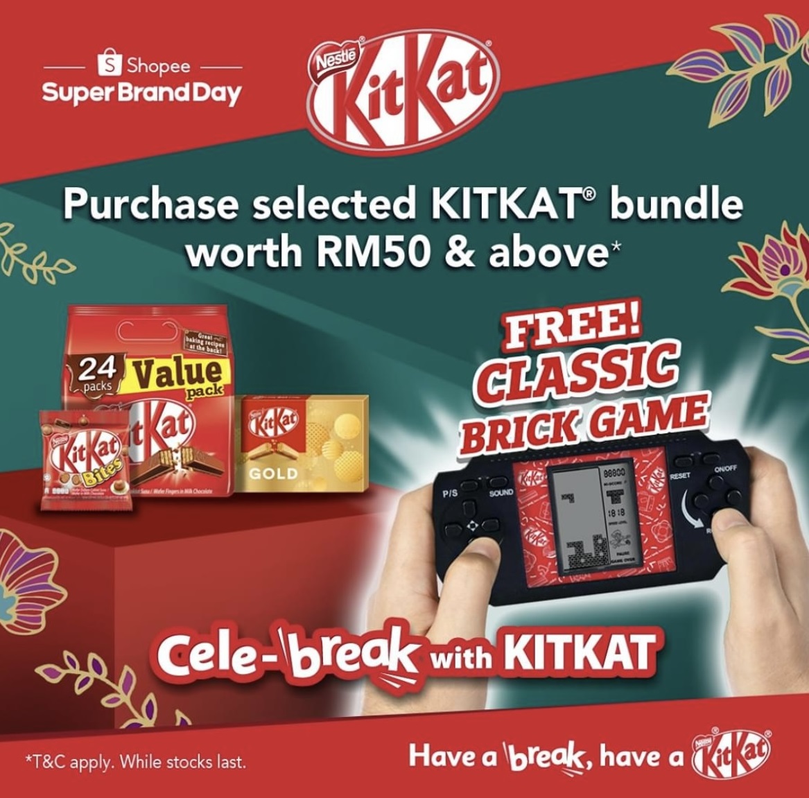 只要在Shopee 购买价值RM50或以上的Kitkat 巧克力就会附送一个限量版游戏机(classic brick game)!