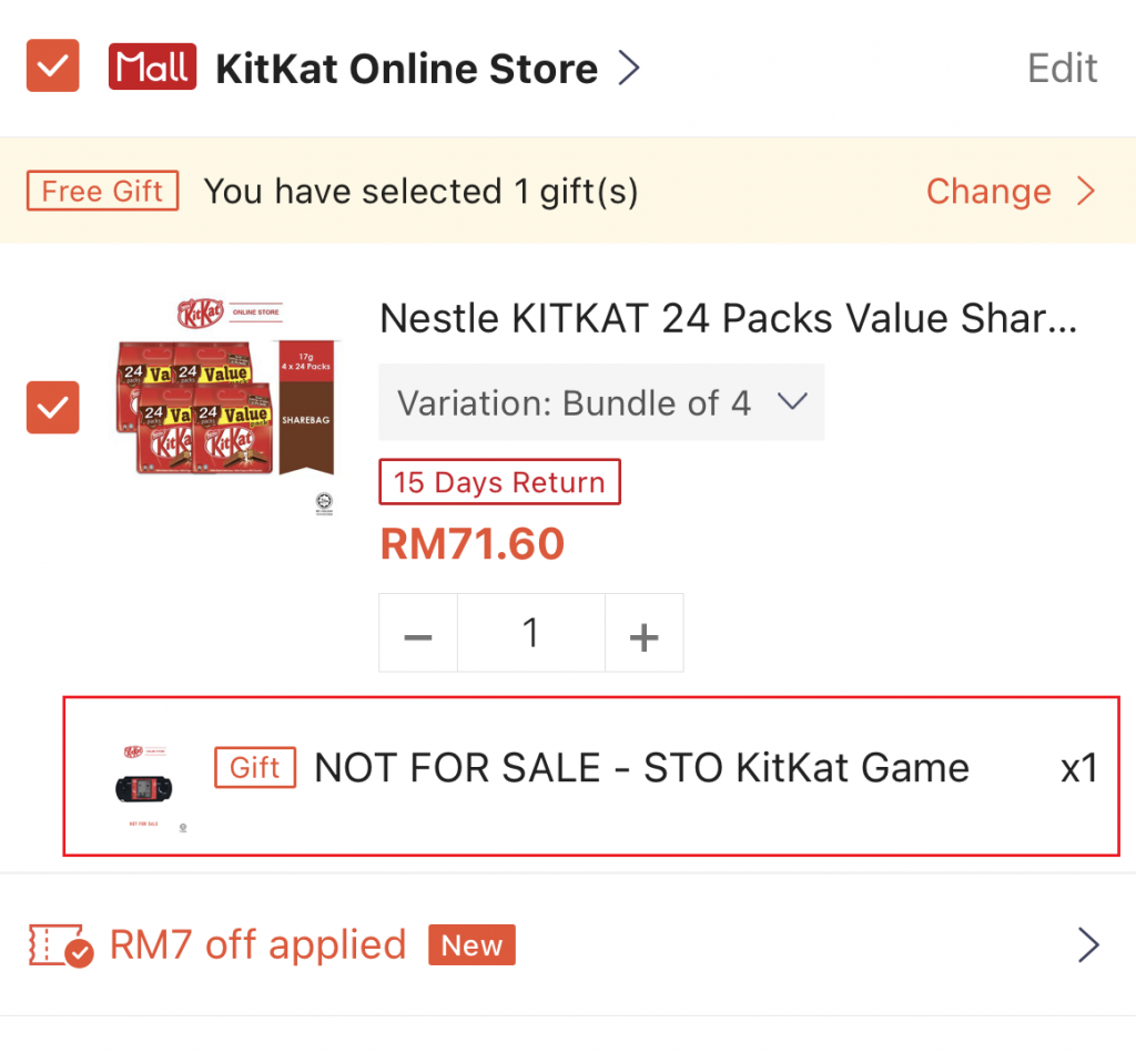 ▼ 比如你可以购买Kitkat 24 packs x4 Bundle套装,然后加入购物车后就会看到显示Gift!