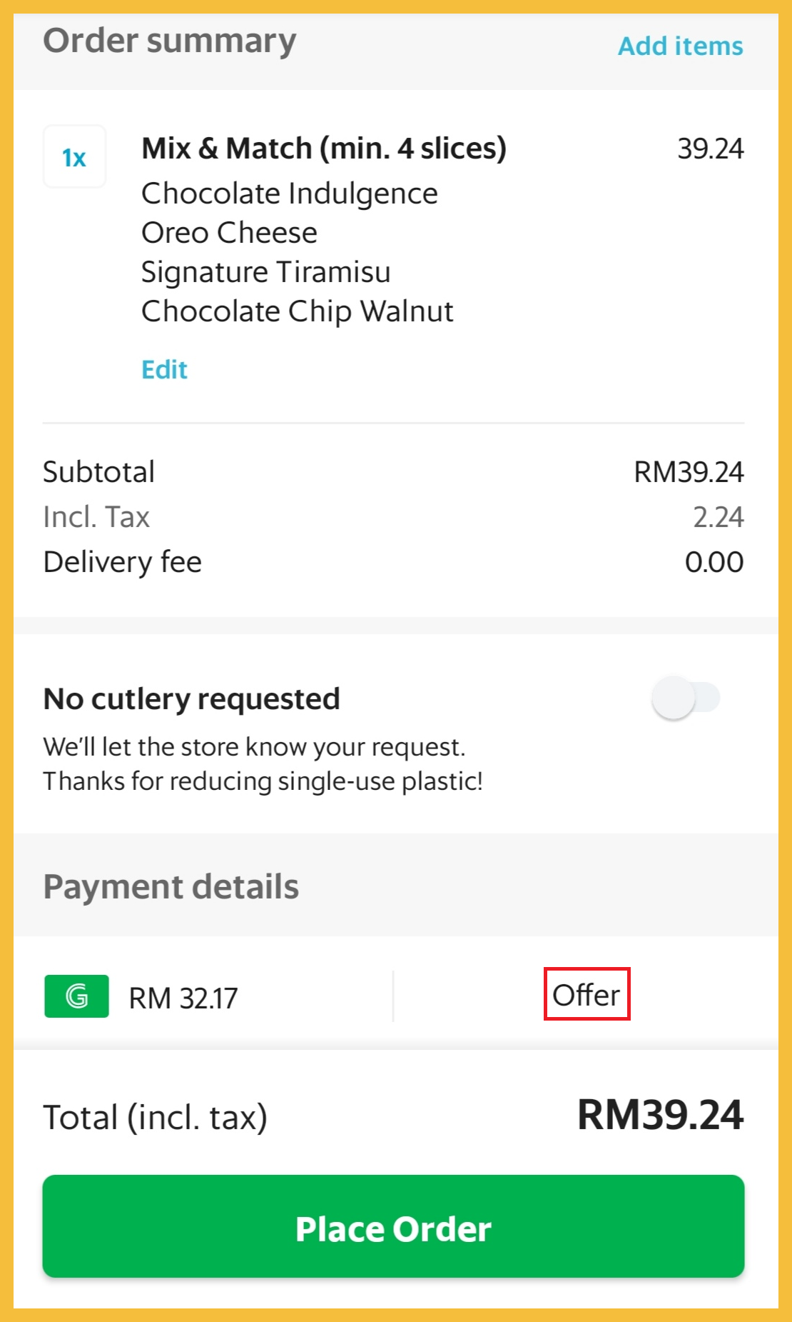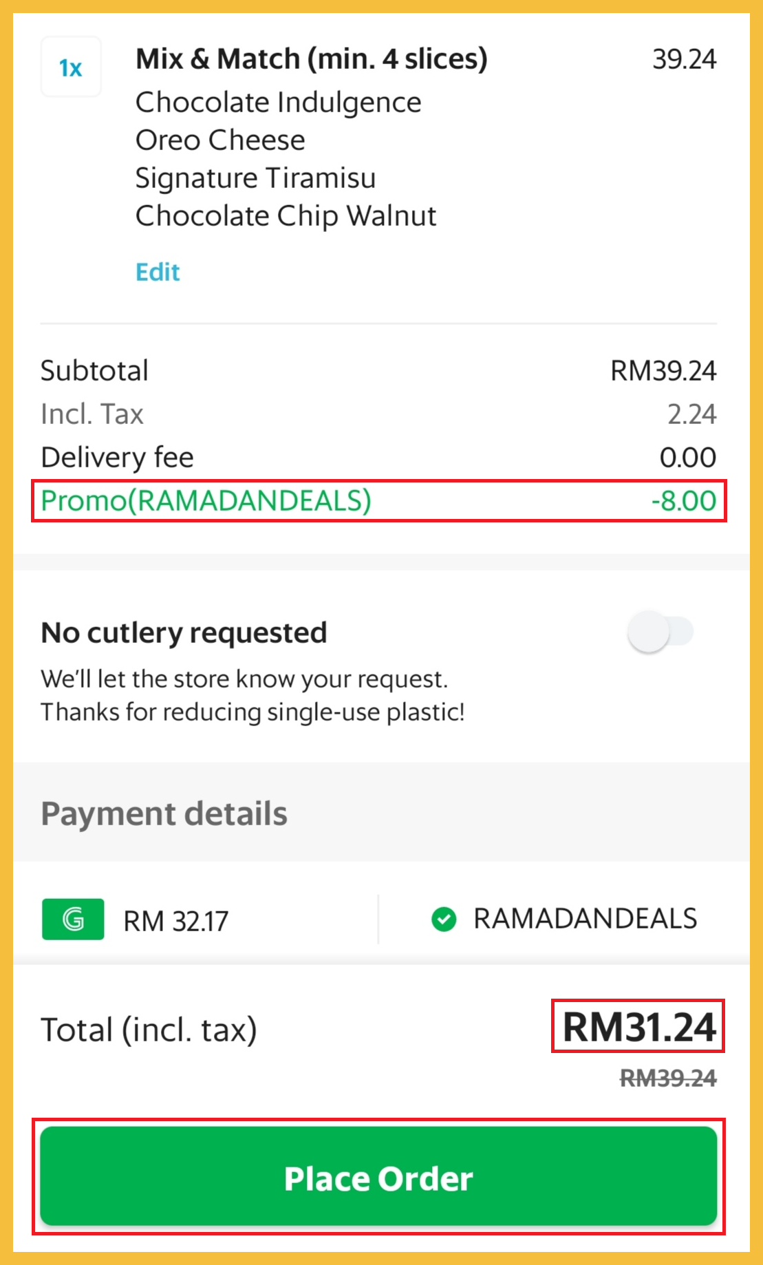 ※ 小编订购Mix & Meal(4块切片蛋糕)原价RM39.24,折扣【RAMADANDEALS】优惠码后只需RM31.24(包括外送费用)!平均一片只需RM7.81!