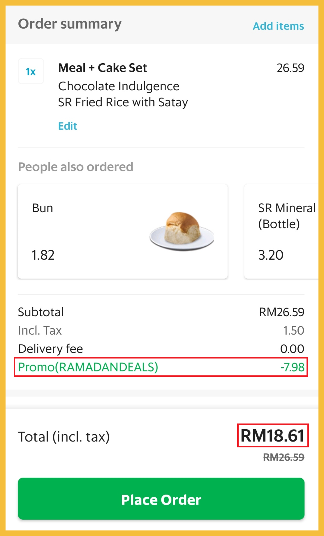 - 此优惠代码不可在星期五、星期六和星期日(仅限吉隆玻和雪兰莪州属)
