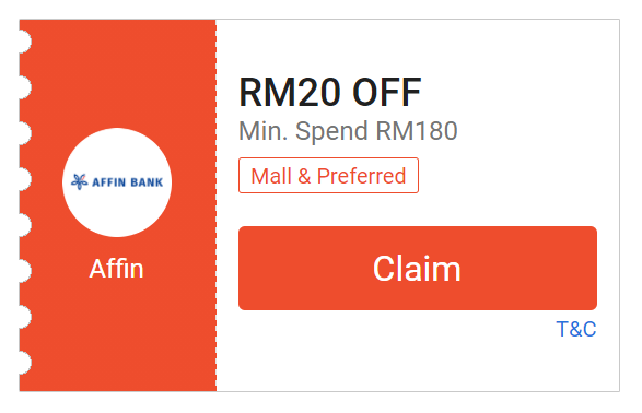 8)Affin Bank —— 消费RM180,可折扣RM20【点击这里】