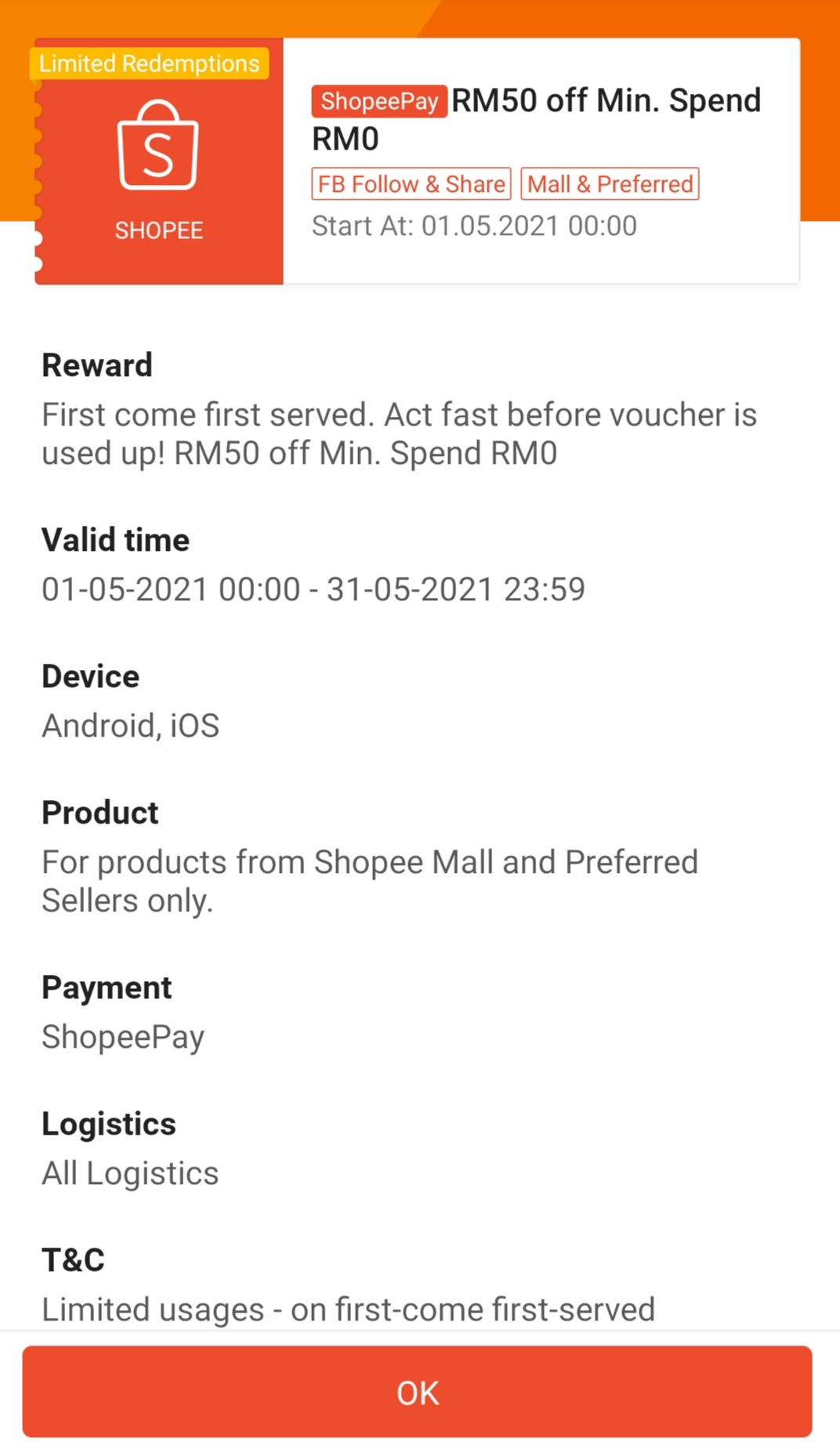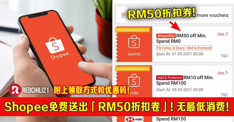 大马Shopee 在这5月份特别送出RM50 折扣券!只要输入有关优惠代码就可领取这RM50 折扣券,无需最低消费哦!