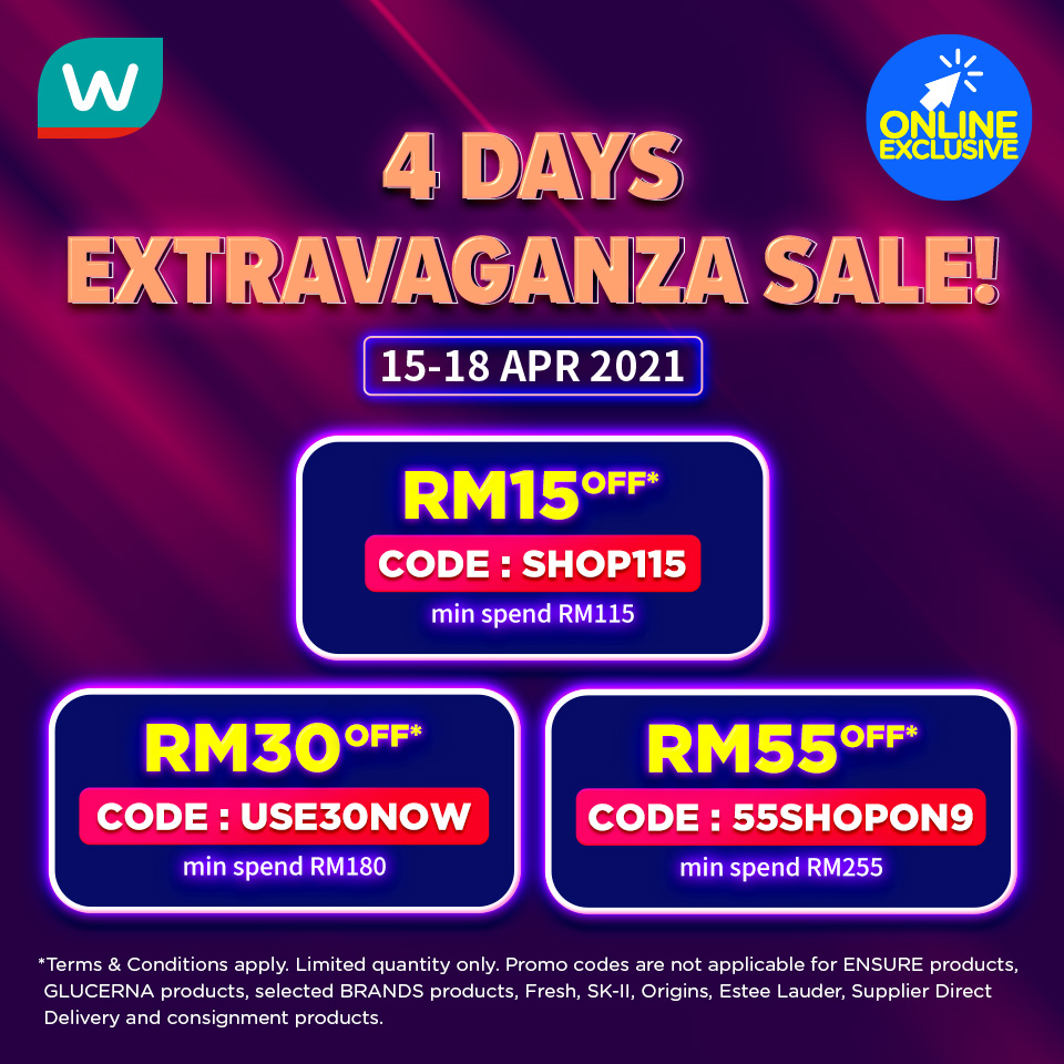 ▼ 此外,你在Watsons 官网消费指定数额,并输入有关优惠代码可获得高达RM55 折扣!优惠日期直到4月18日!