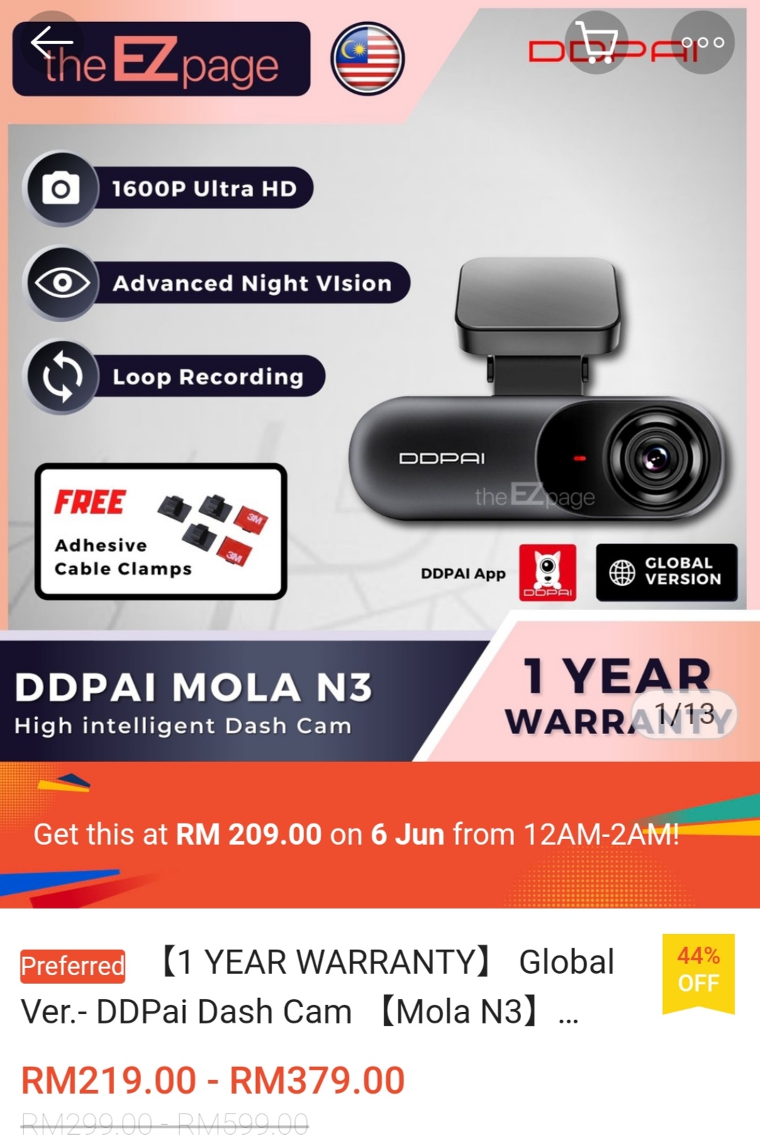 ▼⑤ Global Ver.- DDPai Dash Cam 【Mola N3】 1600P HD GPS Vehicle Drive Auto Video DVR Android Wifi – RM299 – RM599 RM209(6月6日优惠价)