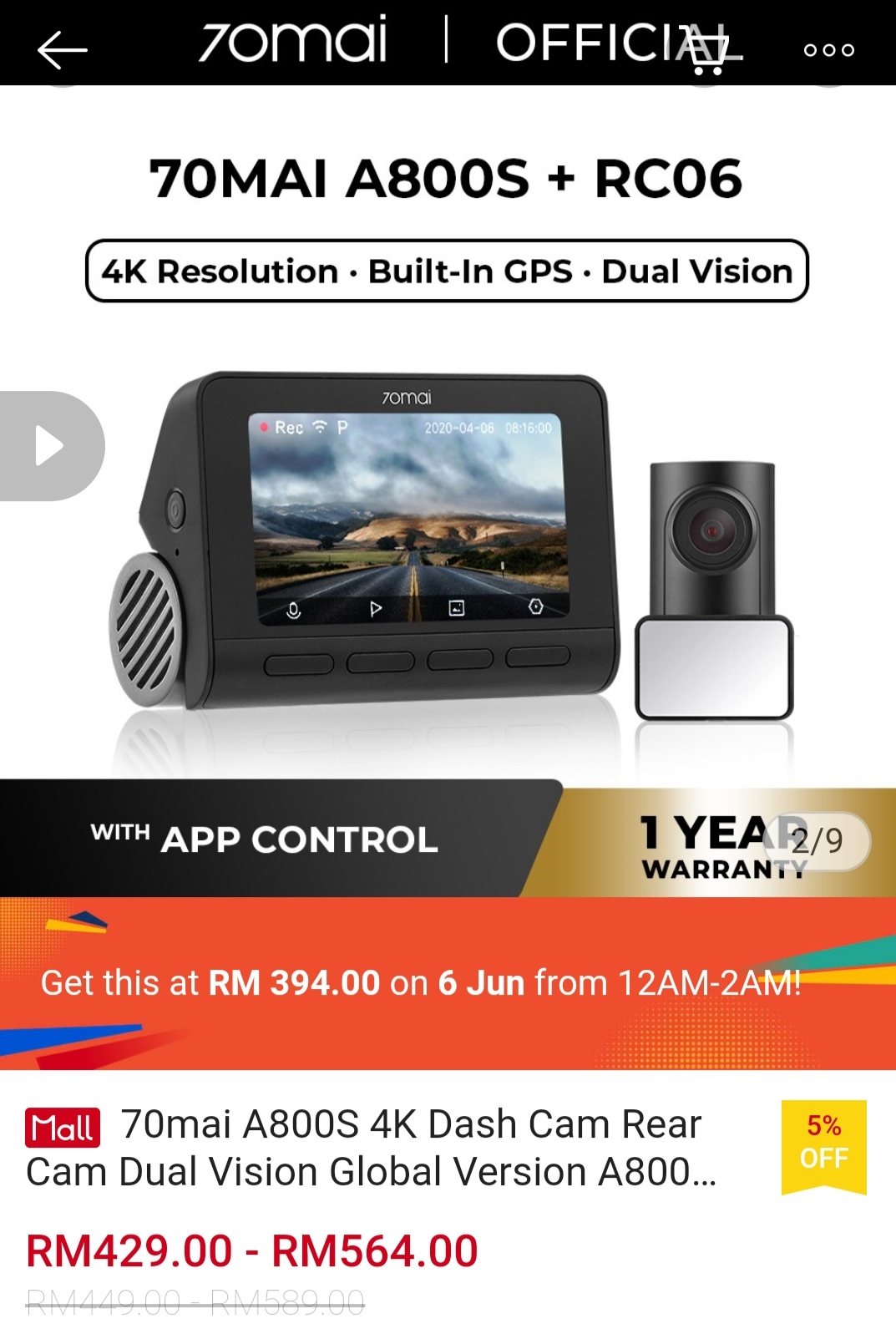 ▼① 70mai A800S 4K Dash Cam Rear Cam Dual Vision Global Version A800 Adas Parking App Control GPS Built in – RM449 – RM589 RM394(6月6日优惠价)
