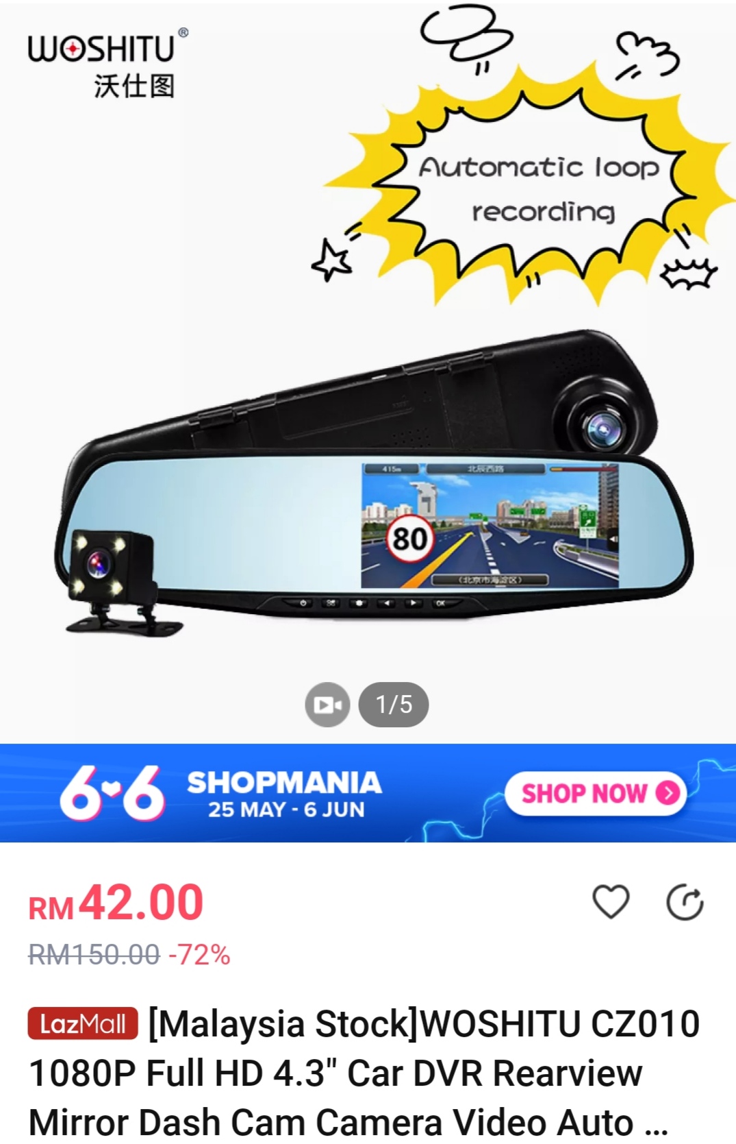 ▼⑨ WOSHITU CZ010 1080P Full HD 4.3″ Car DVR Rearview Mirror Dash Cam – RM150 RM42
