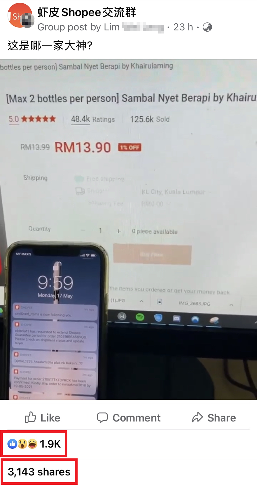 究竟这个卖货卖到20秒内就爆单的“神级”卖家是何方神圣呢?他就是早前网卖 Sambal Nyet 爆红的 Khairul Aming 啦,果然名不虚传啊~20秒内卖出1000罐,RM13.90乘以1000罐=RM13,900!