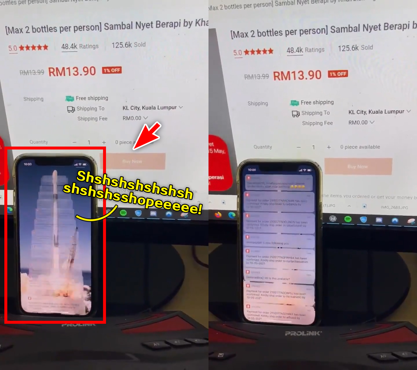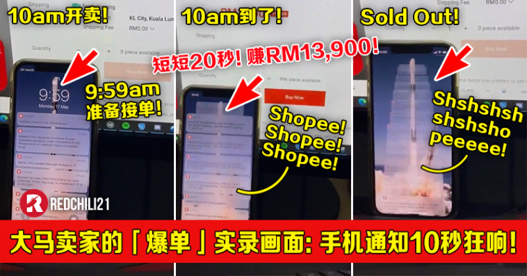 昨天大马网友在“Shopee”交流群的脸书群组分享一段“爆单”视频,一名大马卖家在 Shopee 发售仅仅一种商品,短短20秒就全数卖光(Sold out),最吸引关注的就是旁边那台接单接到爆的手机!