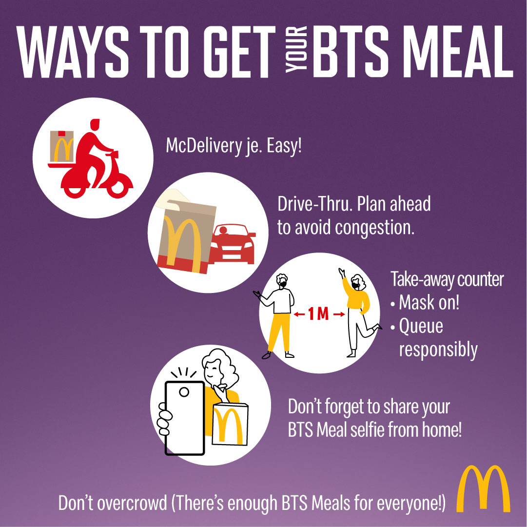 想要购买BTS 套餐的朋友,可通过McDelivery、Take-Away及Drive-Thru 方式购买!防疫期间倘若要出门购买一定要遵守SOP、戴好口罩以及勤洗手消毒哦!