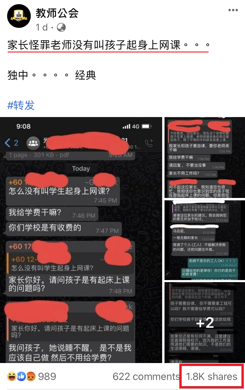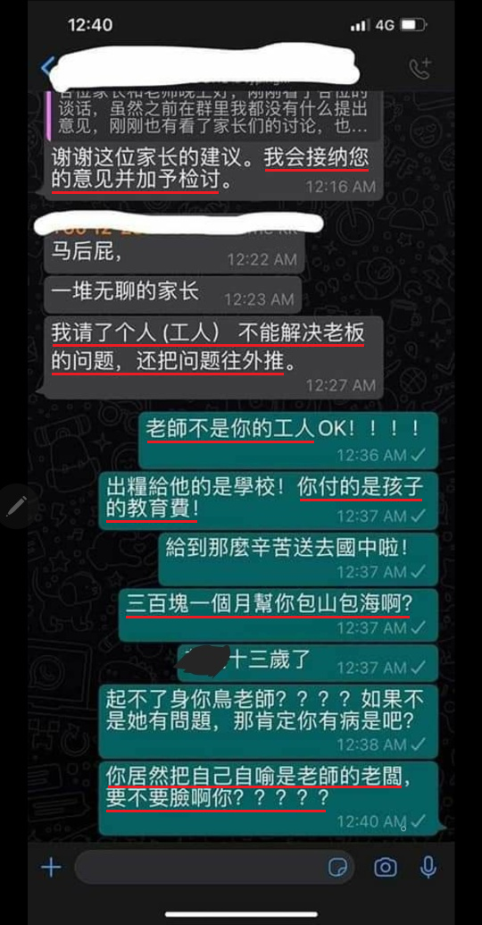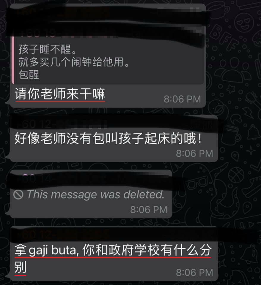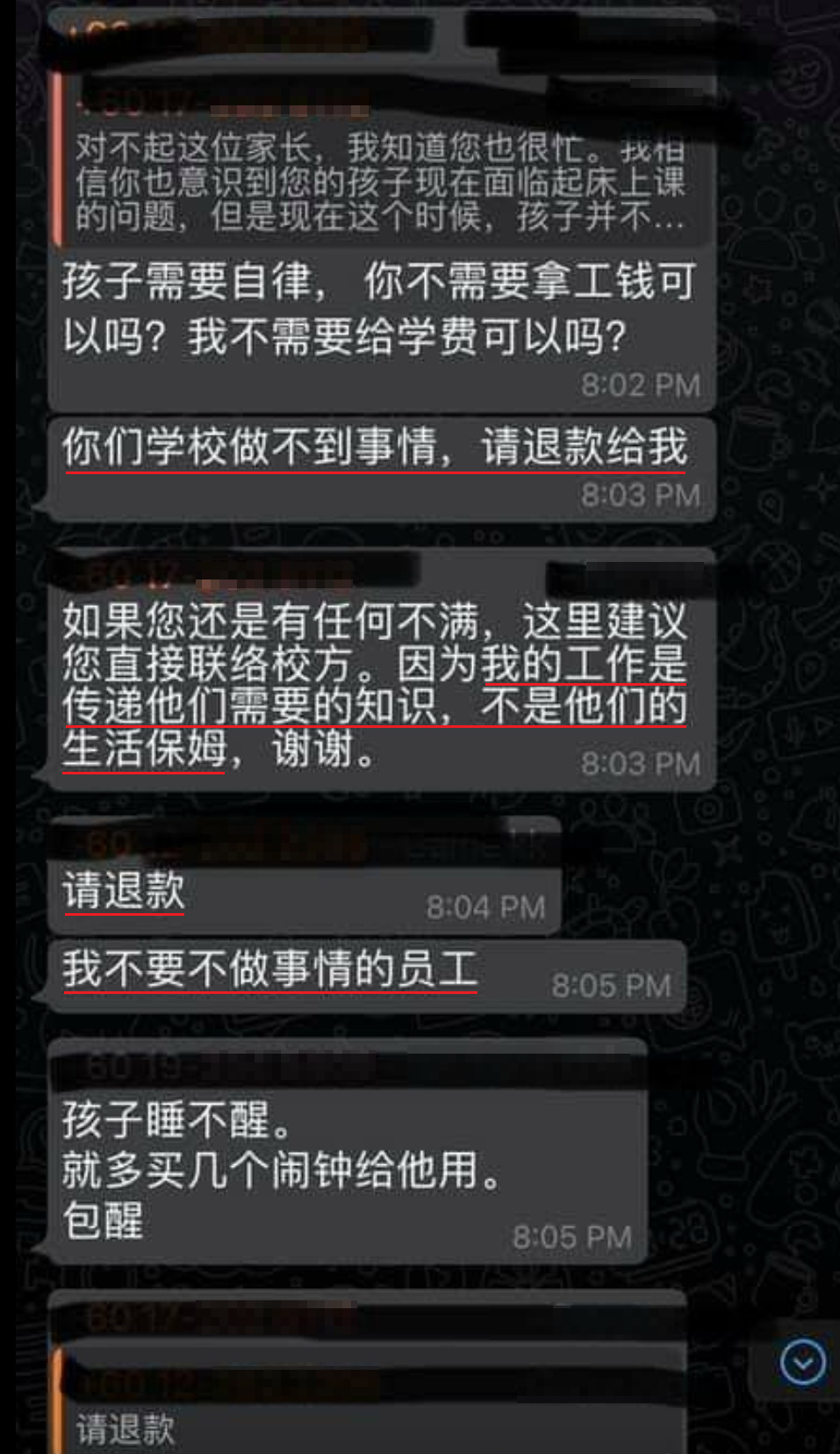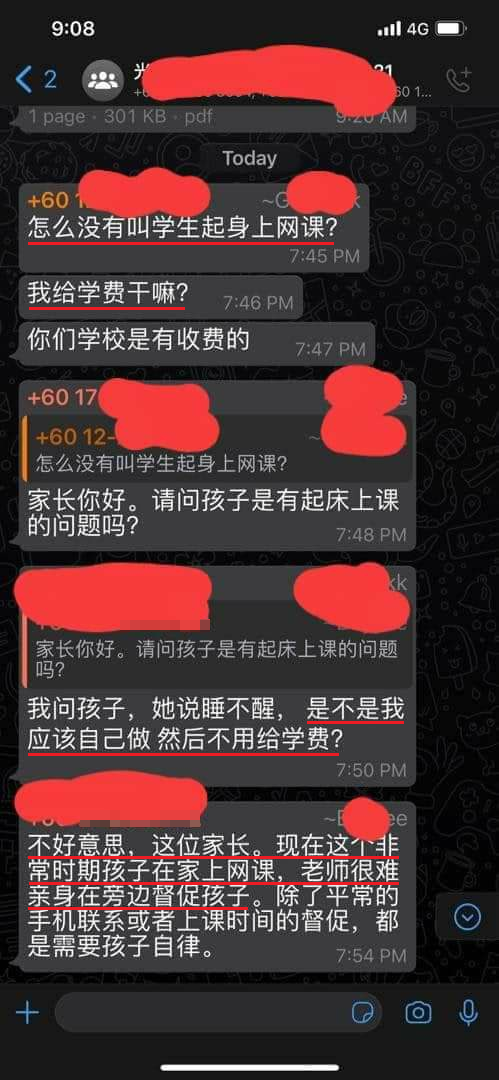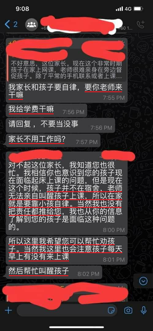 近日,网上流传一段 WhatsApp 群组的对话截图,大马某个独中学校的家长责怪老师没有叫她的孩子起床上网课,一再地强调老师是她“付钱聘请的员工”。
