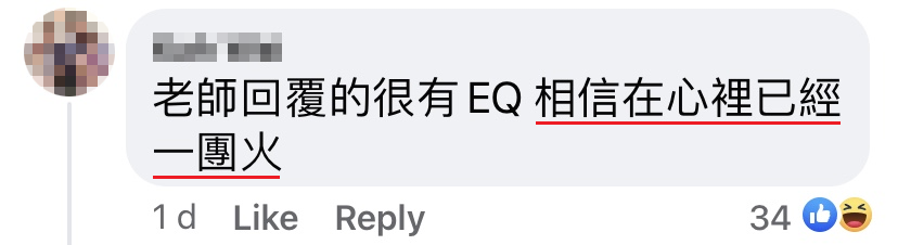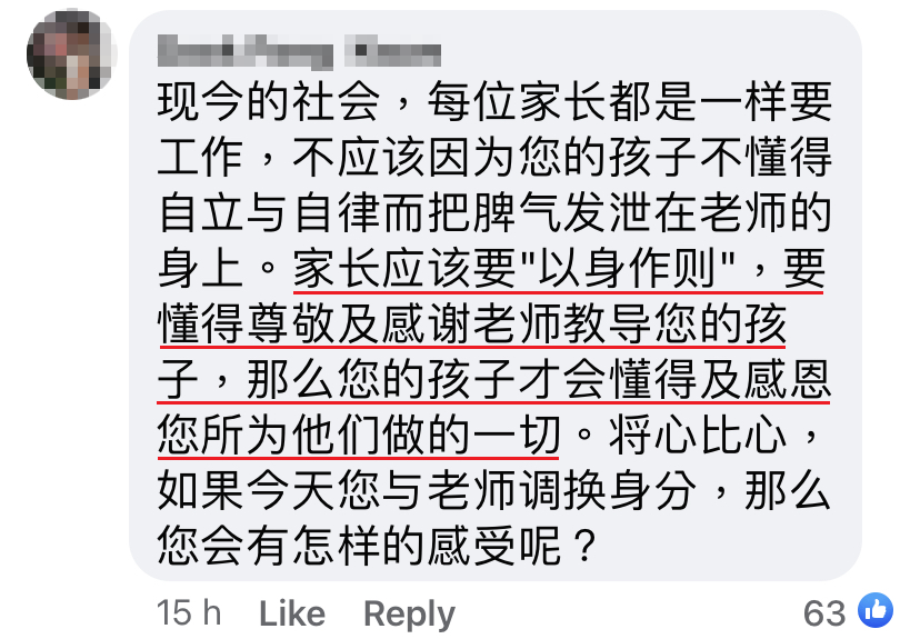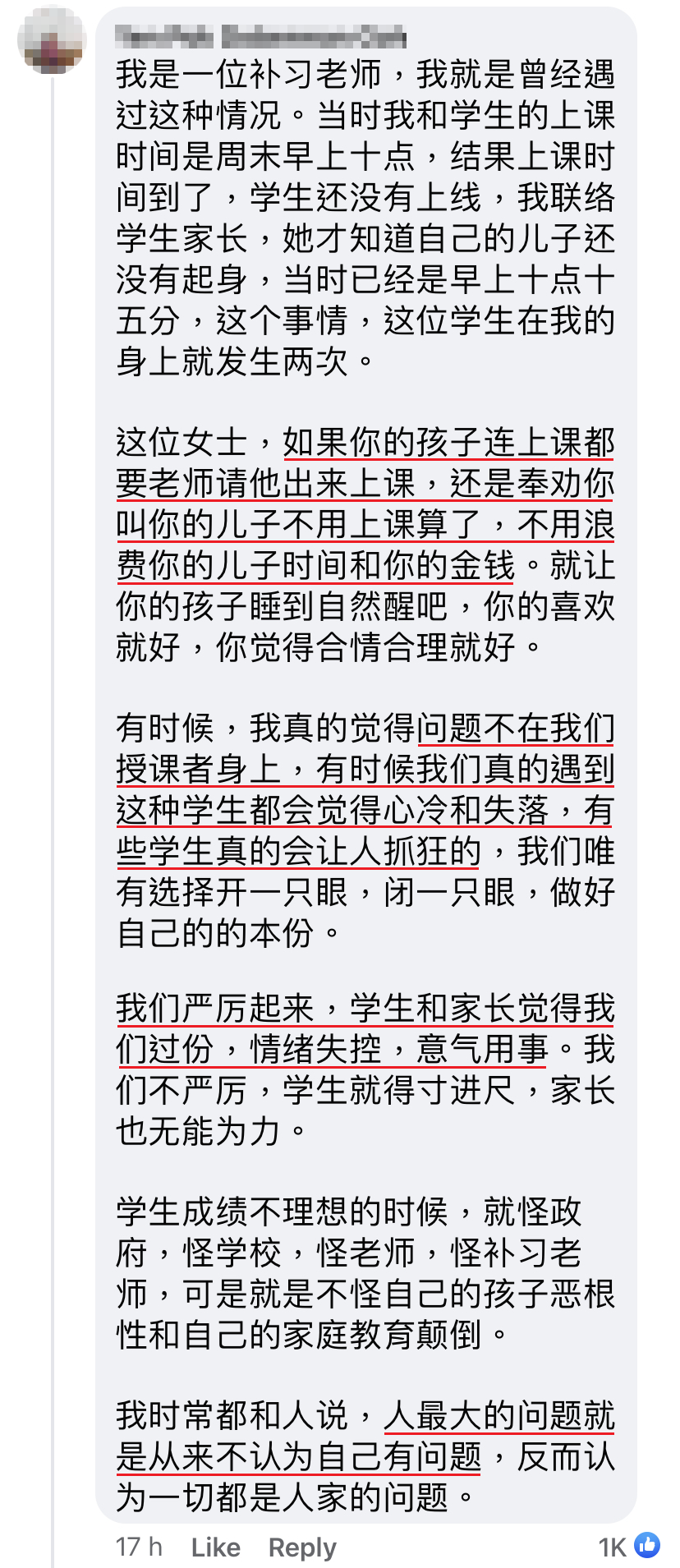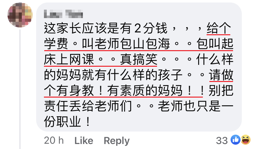 老师:「如果您还是有任何不满,这里建议您直接联络校方。因为我的工作是传递他们需要的知识,不是他们的生活保姆,谢谢。」