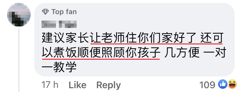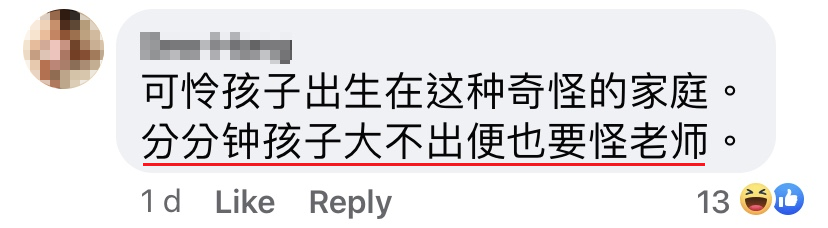 其他家长看不下去发言了:「老师不是你的工人OK!!!出粮给他的是学校!你付的是孩子的教育费!给到那么辛苦,送去国中啦!三百块一个月帮你包山包海啊?你居然把自己自喻是老师的老板,要不要脸啊你???」