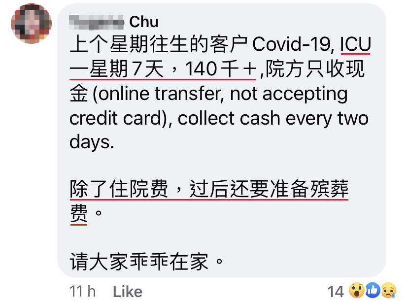 保守估计一天的费用是RM2000-3000,一般住院最少10天,光是抵押金就RM20,000。如果一家大小都入院,你自己算算看。