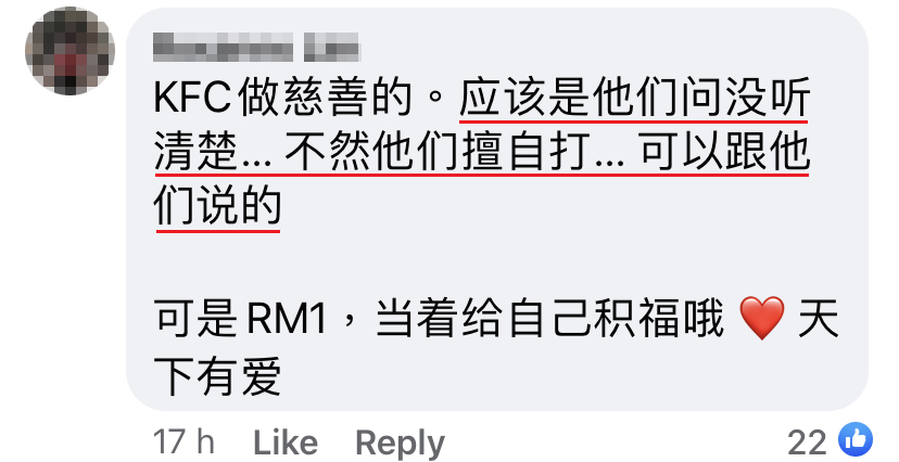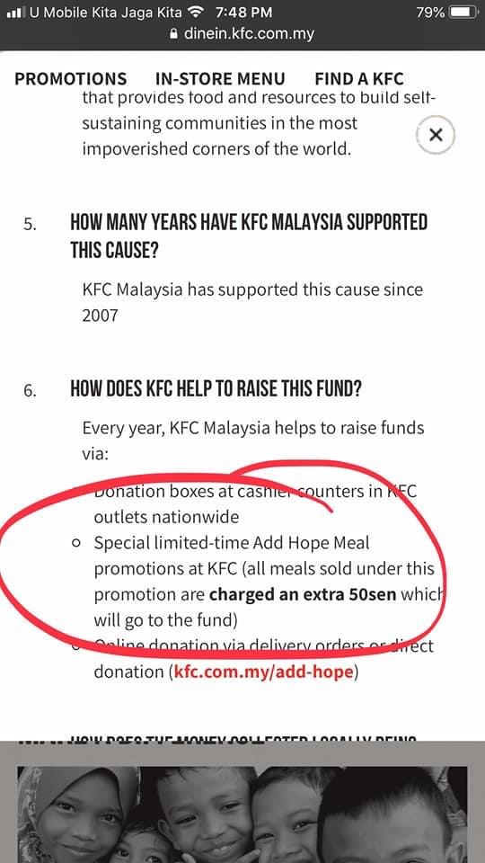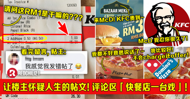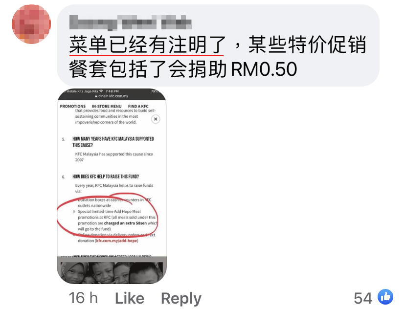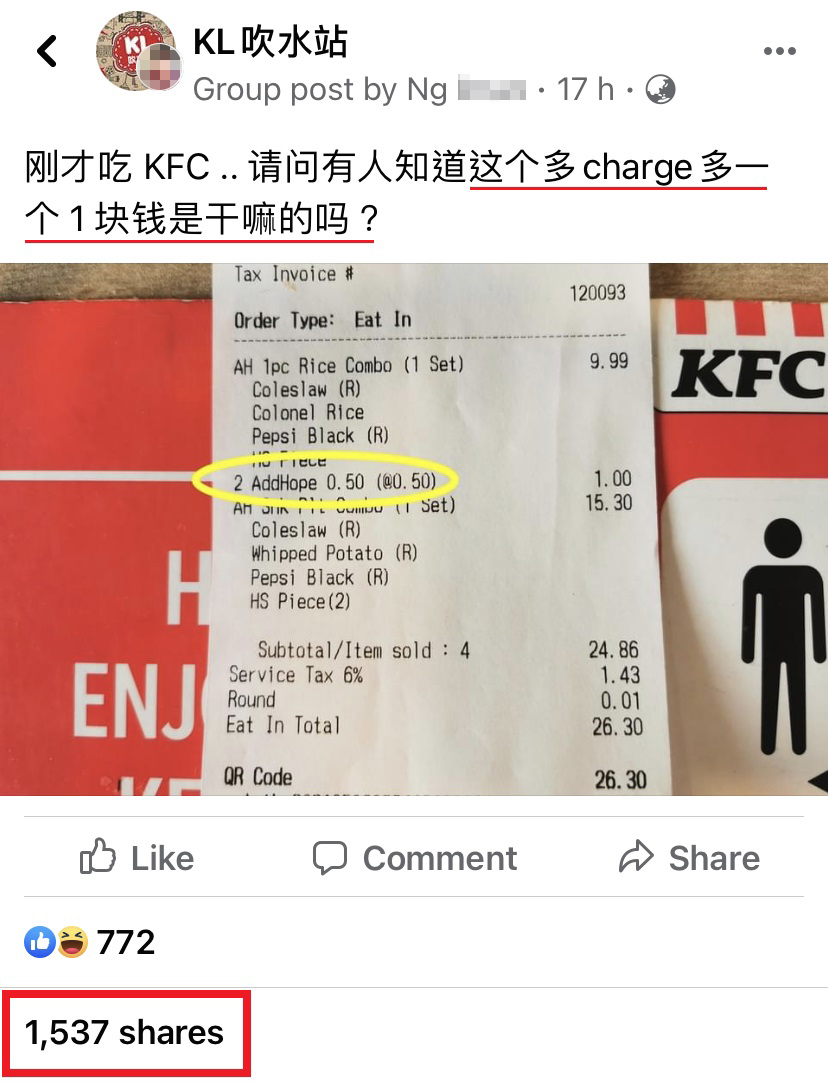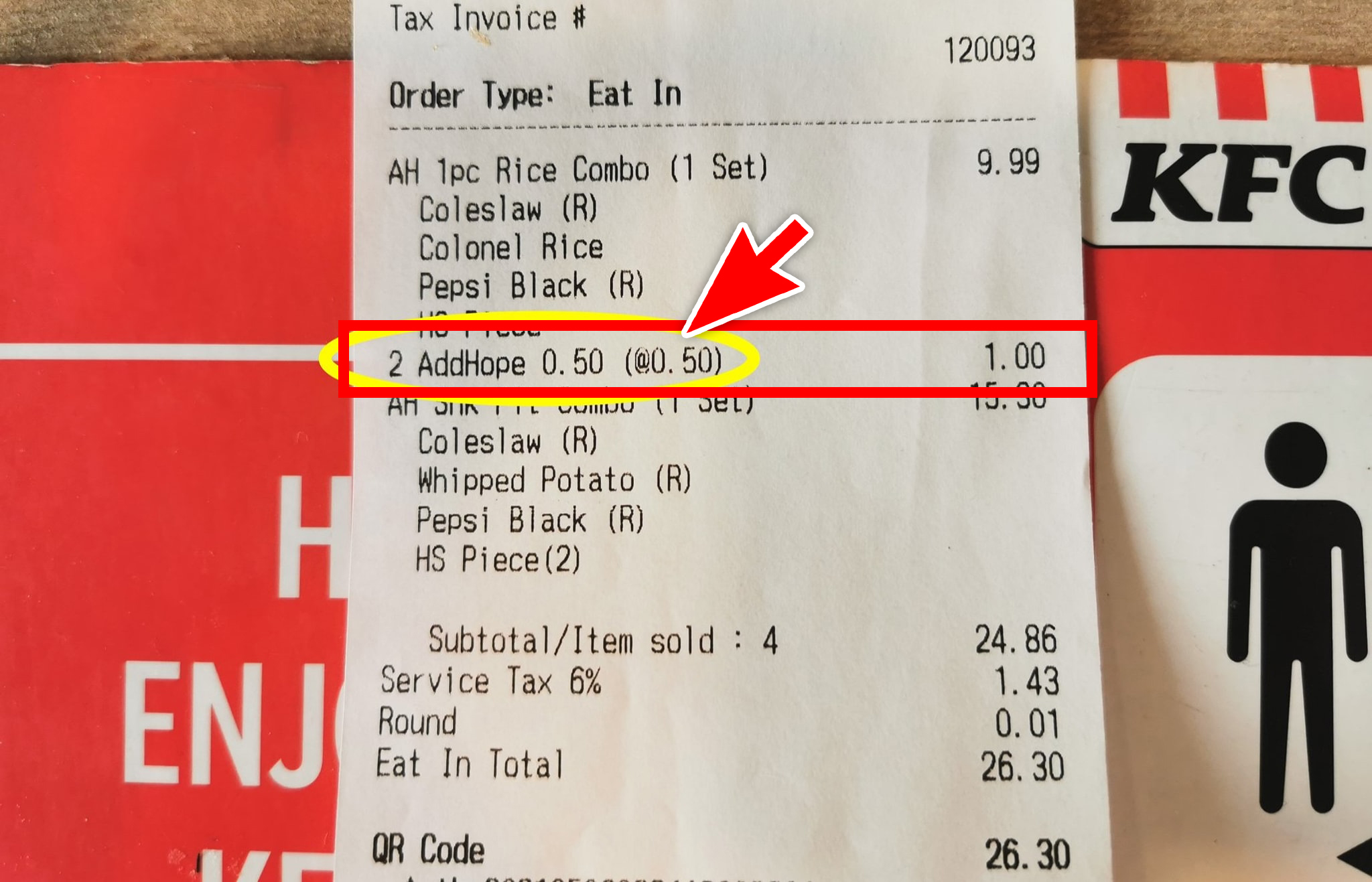 ▼ 原PO在帖文中写道,去大马某一间 KFC 分店点餐,结果结帐的时候发现收据上多了一个“Add Hope”的 RM1 收费。