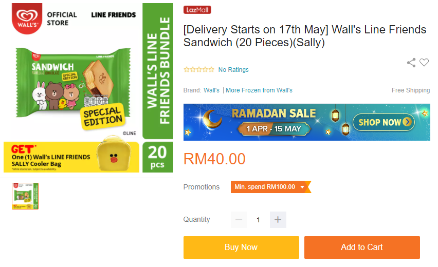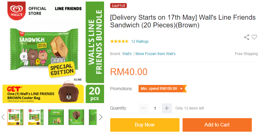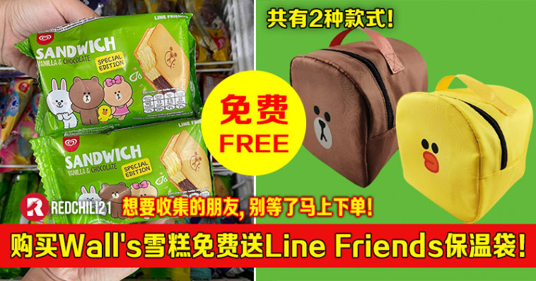 只要你通过Lazada Wall’s 官网购买Line Friends 三明治雪糕,就能免费获得Line Friends 限量版保温袋!