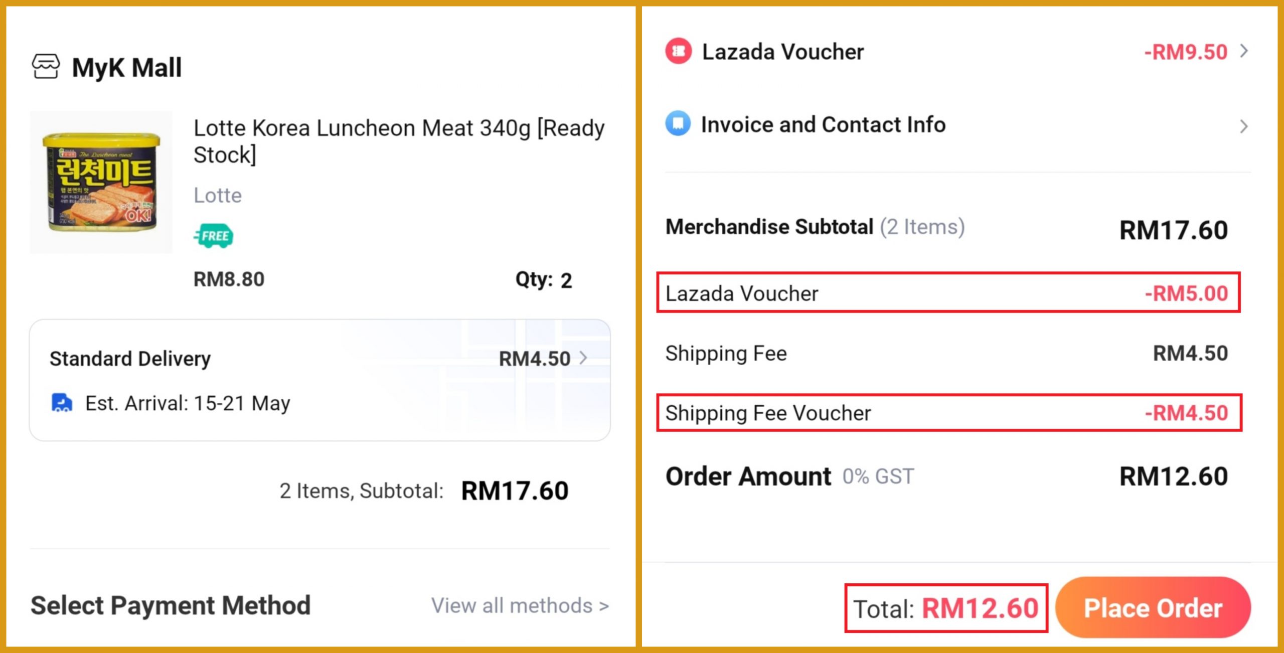 ③ 2罐Lotte 午餐肉(原价RM17.60)折扣RM5 优惠券 +免邮券,只需RM12.60!平均一罐只需RM6.30!