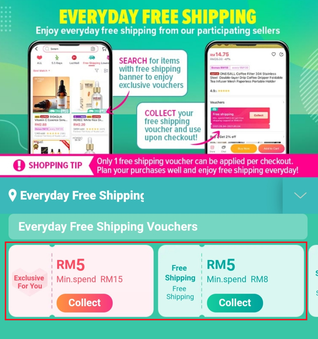 ① 首先打开Lazada App,领取RM5 折扣券和免邮券【点击这里】