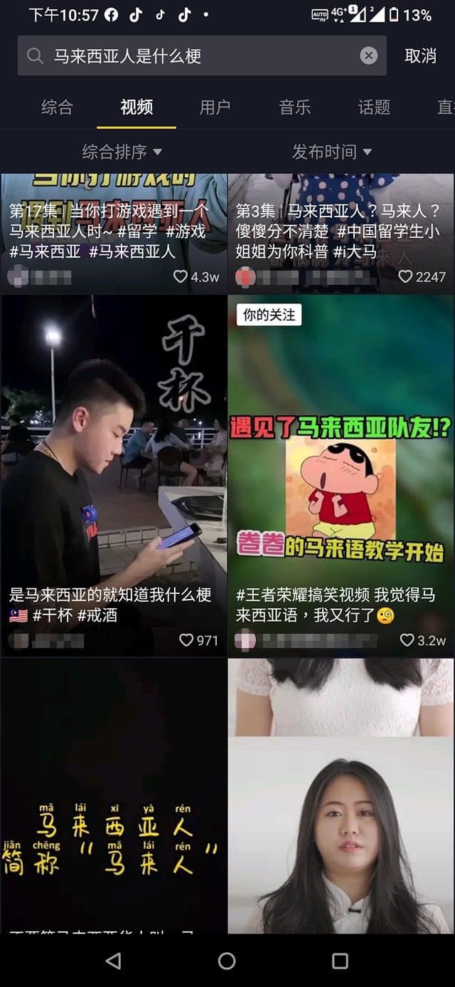 近日一名大马网友在群组上传一张手机截图,在中国版的抖音搜索“马来西亚”,出现的10个搜索结果竟然是这样的画面!