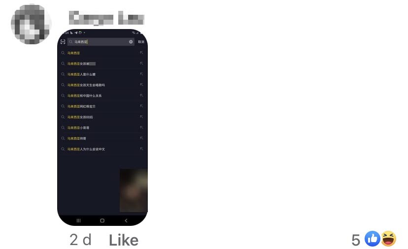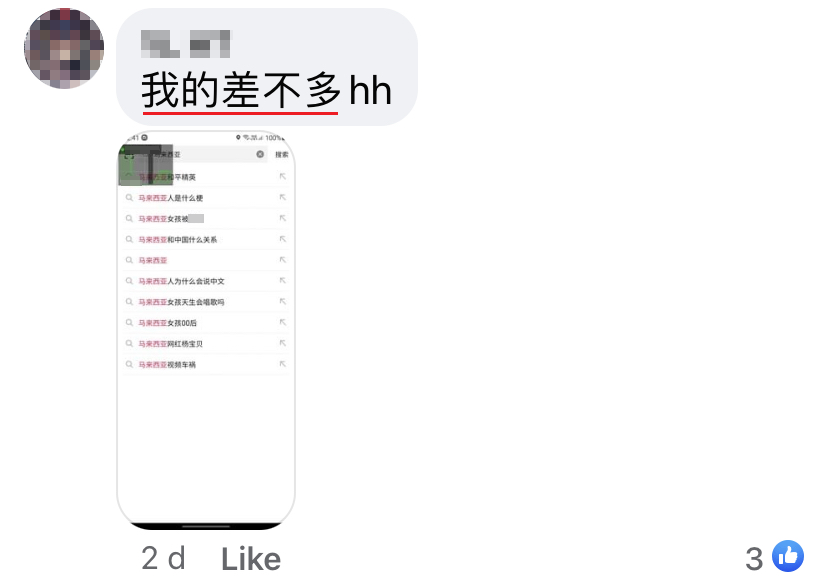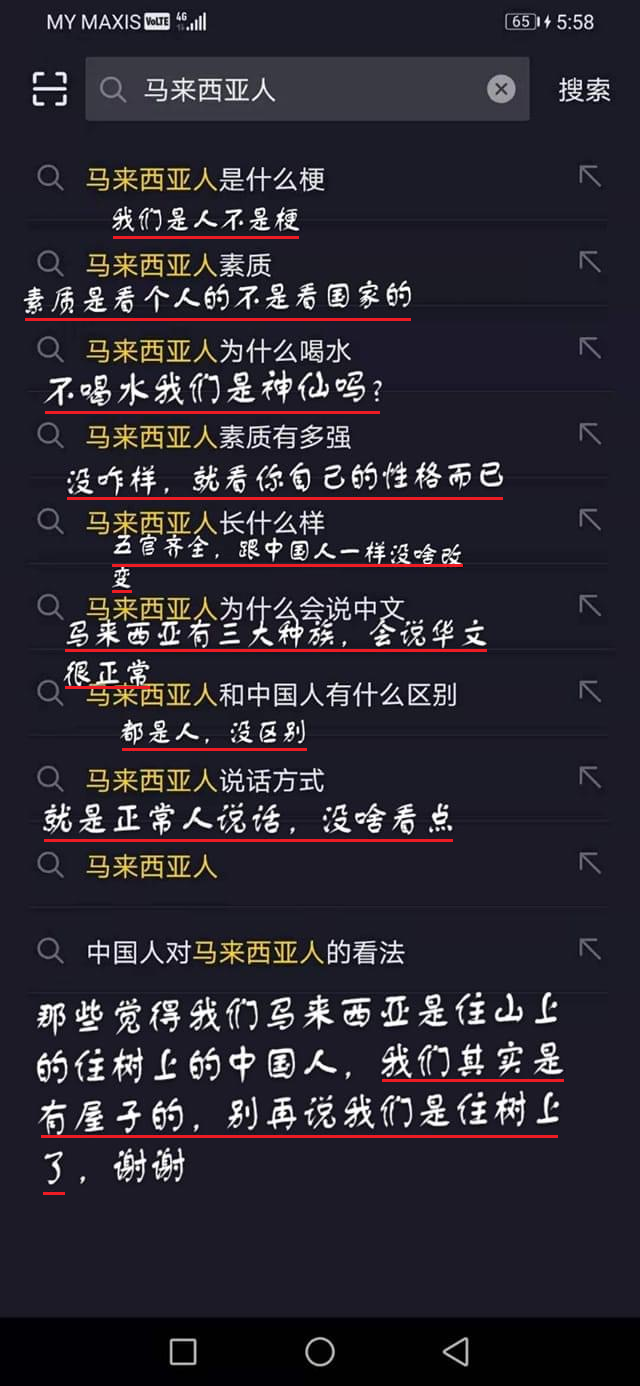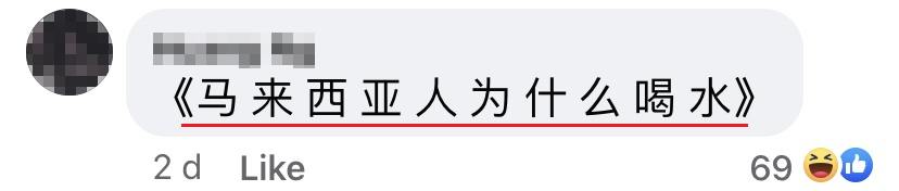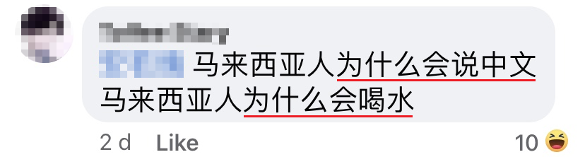 这10个搜索结果包括了“马来西亚人是什么梗”、“马来西亚人素质”、“马来西亚人是中国人吗”等等,其中最令大马人诧异的是“马来西亚人为什么喝水”以及“马来西亚人为什么会说中文”。(大马人的内心OS:黑人问号???)