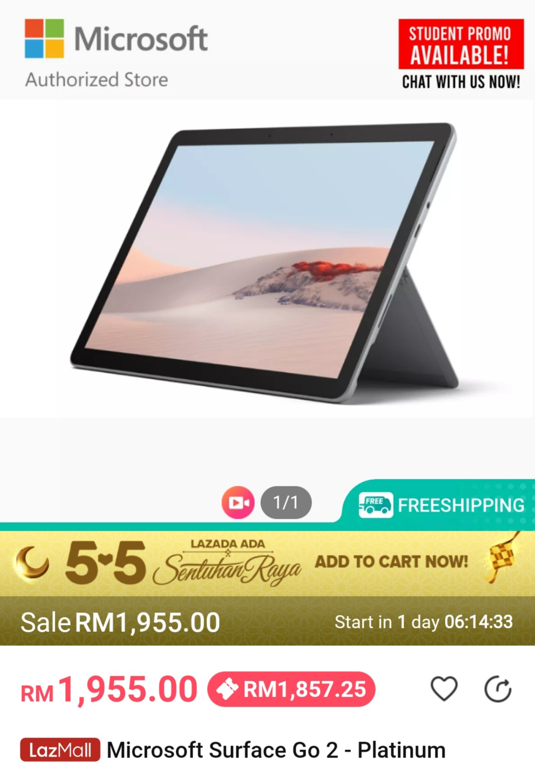 ▪ Microsoft Surface Go 2 – Platinum – RM1955 RM1857.25(领取高达5%优惠券后的折扣价格)【点击这里】