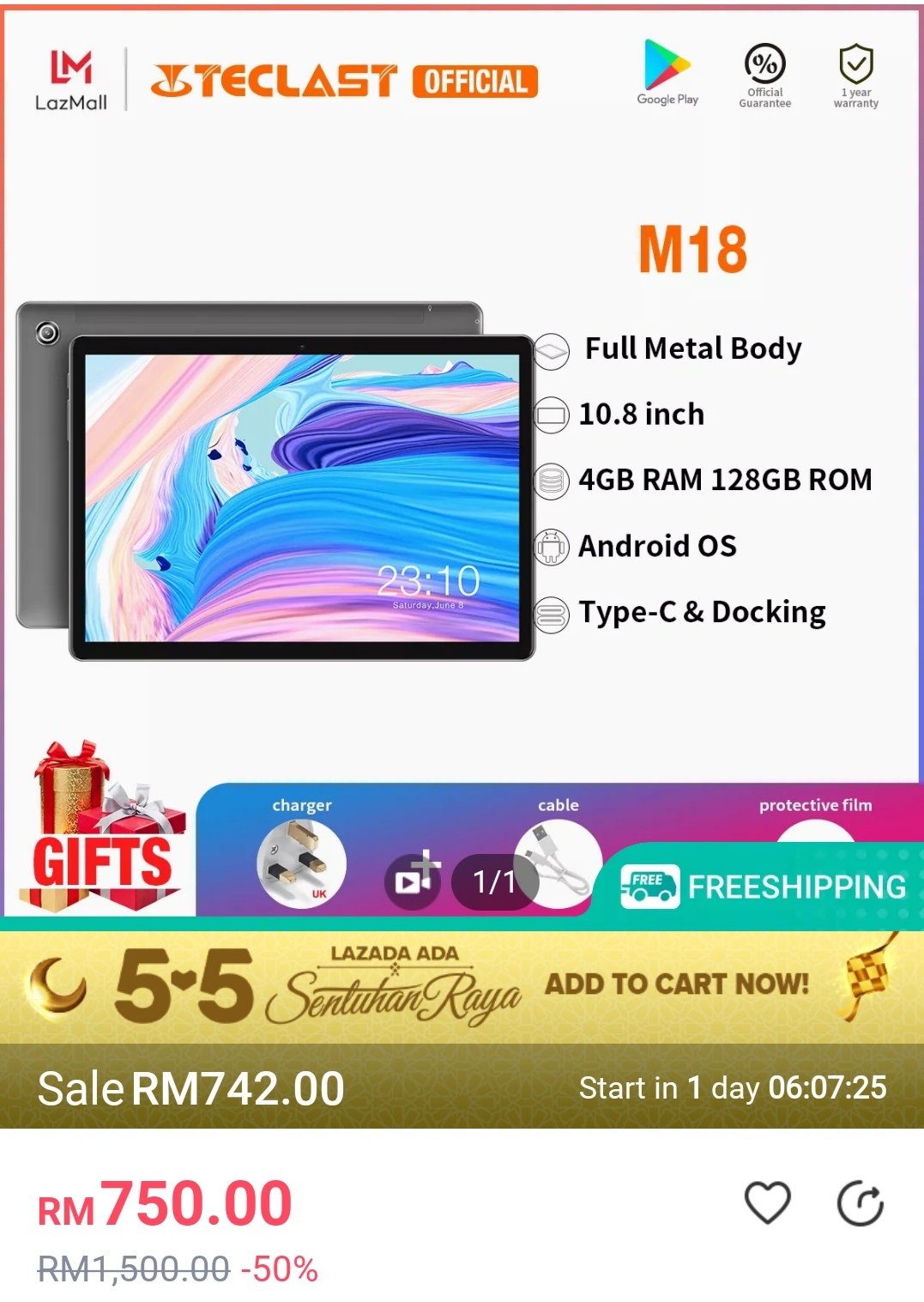 ▪ Teclast Official M16/M18 Android Tablets 10.8 Inch IPS Tablet 4GB RAM 128GB ROM – RM1500 RM742【点击这里】