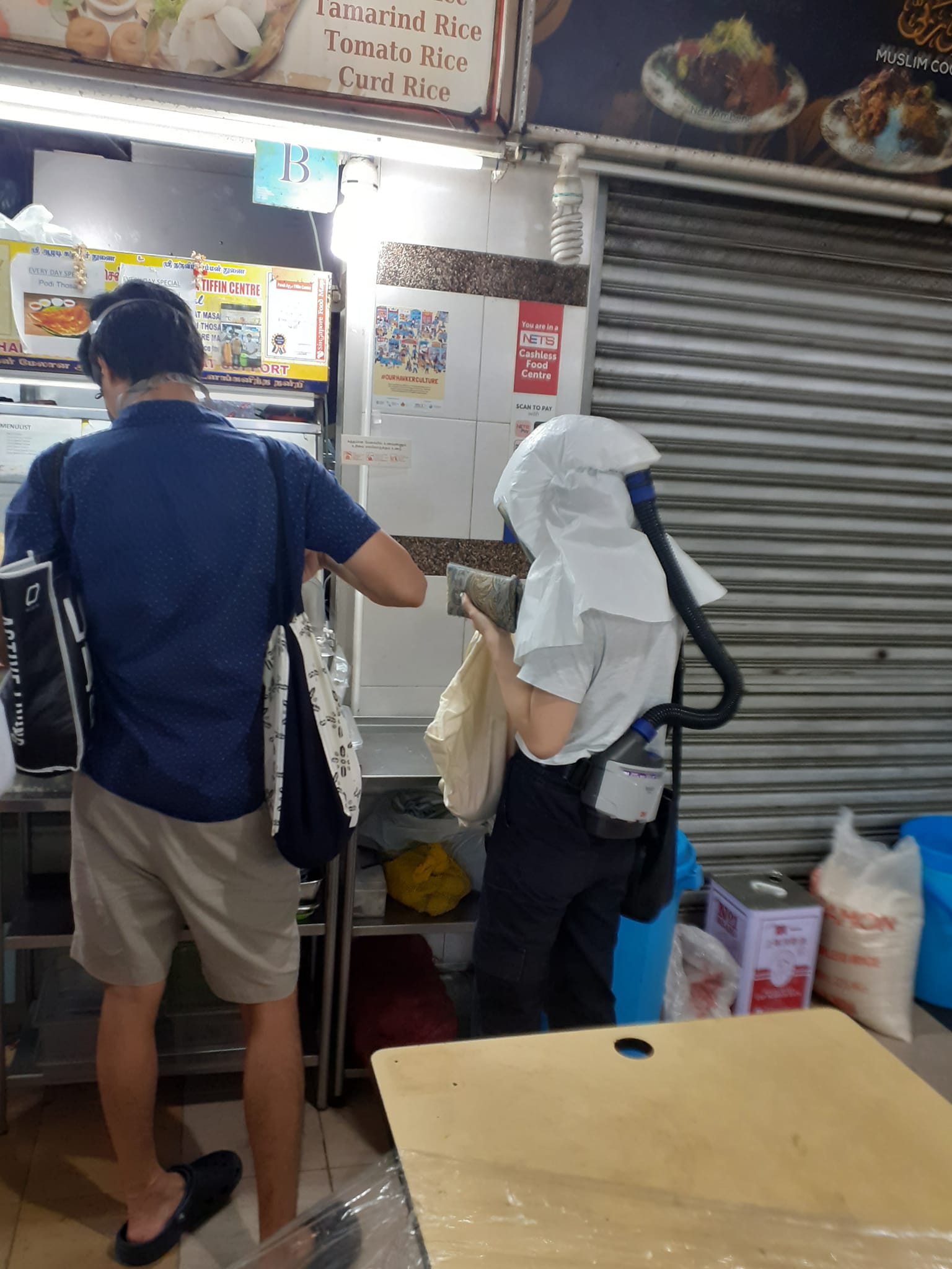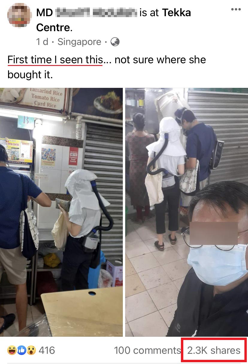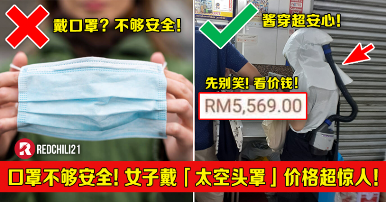 仅仅戴口罩出门不够安全?那就这样吧!近日网上流传一组照片,一名新加坡女子戴着像是太空服的巨大头罩出现在小贩中心,网友看到以后觉得很新奇就拍照PO在脸书,从而掀起热议。