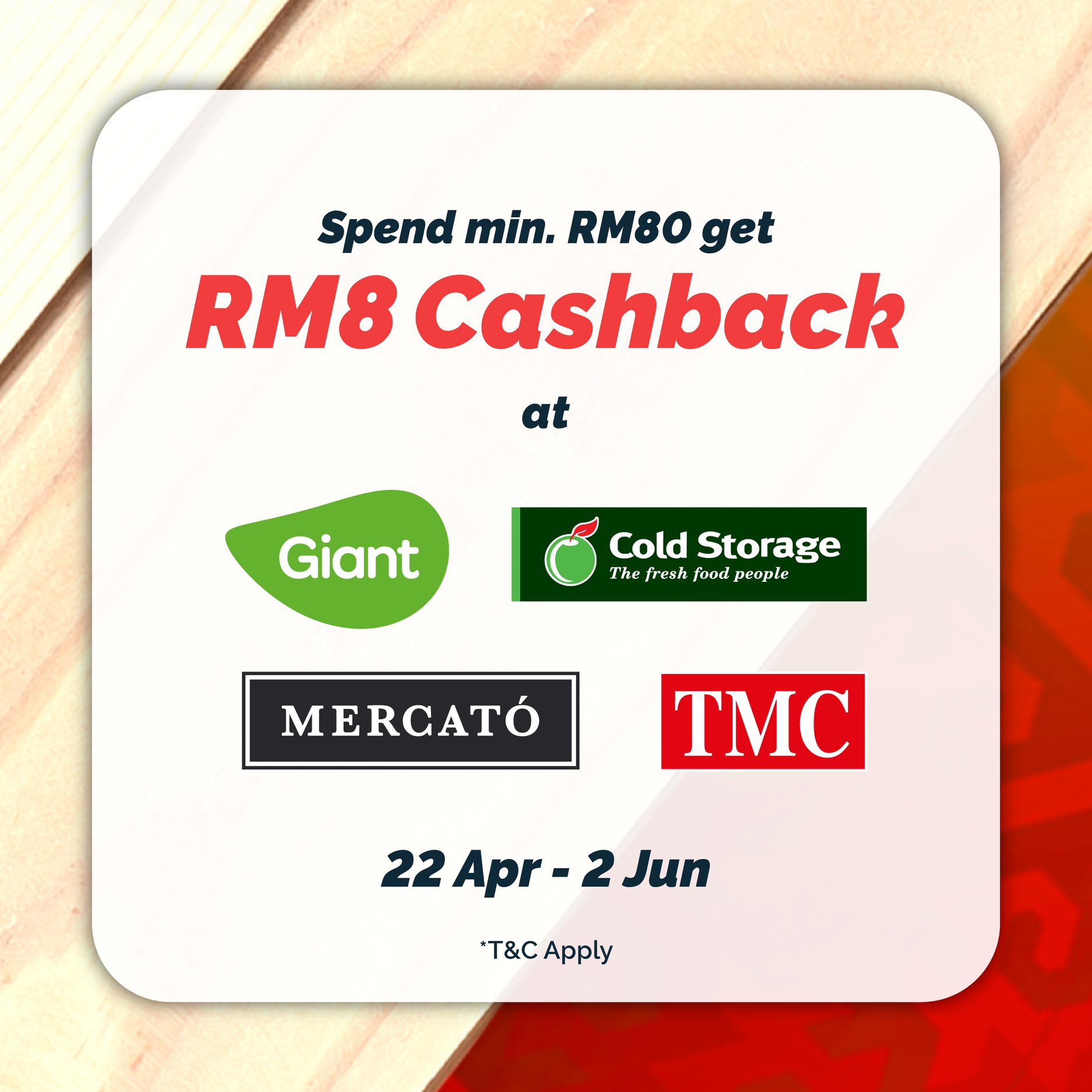 - 用户可在Cold Storage 超市获得2次RM8 现金回扣(高达RM16 现金回扣)