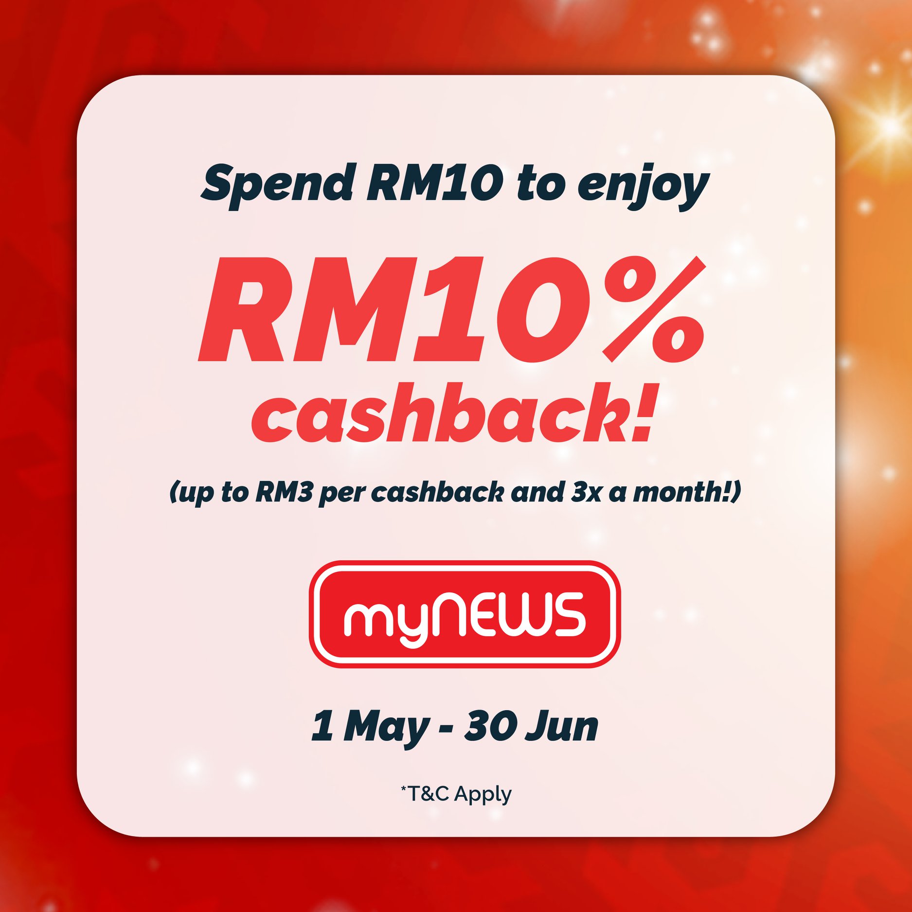 - 消费RM10 或以上,可获得10% 回扣券(最高可获得RM3 现金回扣)