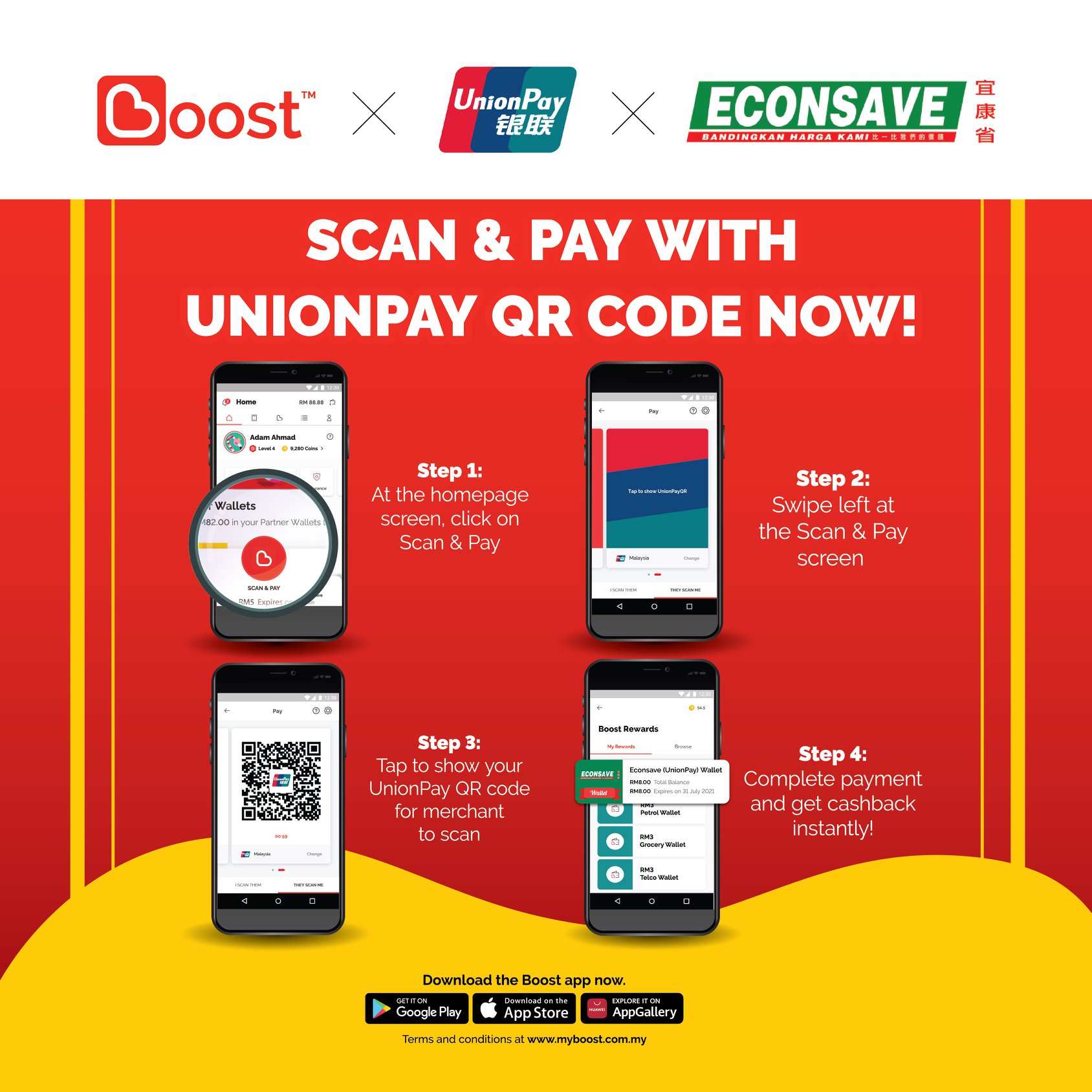 - 必须使用Boost 电子钱包的UnionPay QR 付款