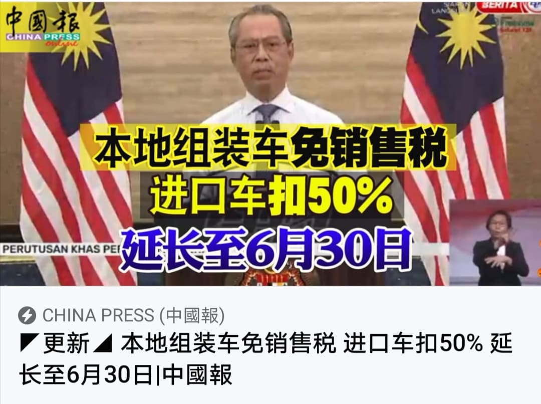首相宣布,早前落实的本地组装汽车销售税扣100%,而整装进口(CBU)新车免除50%销售税措施,将延长到2021年6月30日。