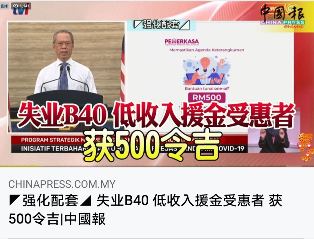 1. 低收入&失业B40 群体可获得RM500 援助金