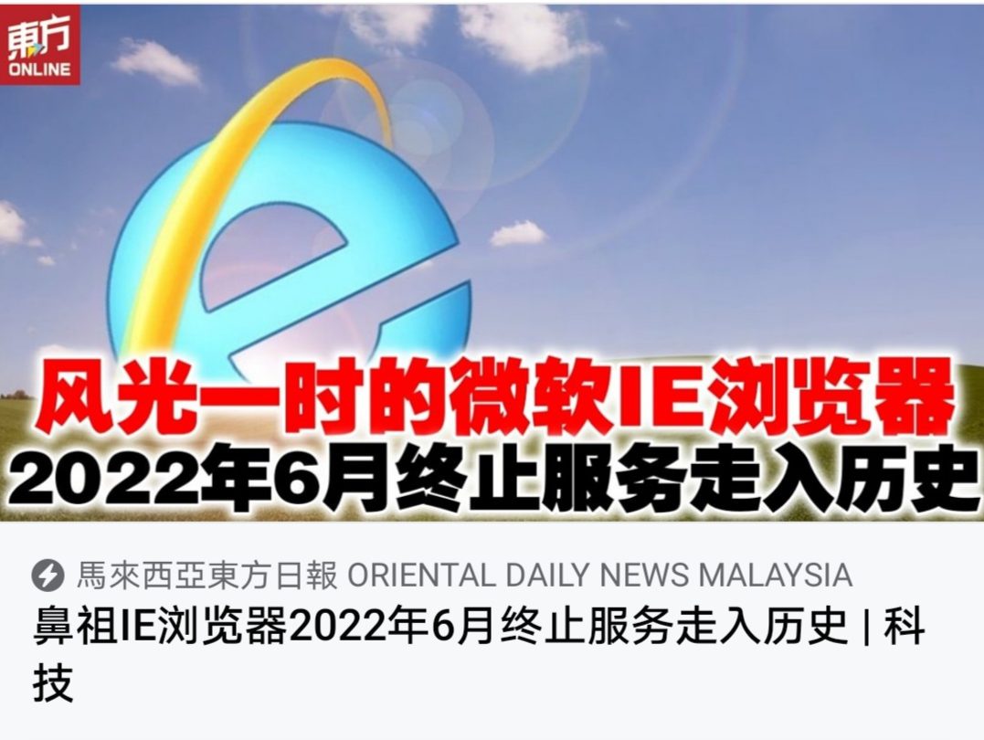 科技企业微软的Internet Explorer(IE)浏览器将于2022年6月15日起停止服务,不再支援某些版本的Windows 10作业系统。