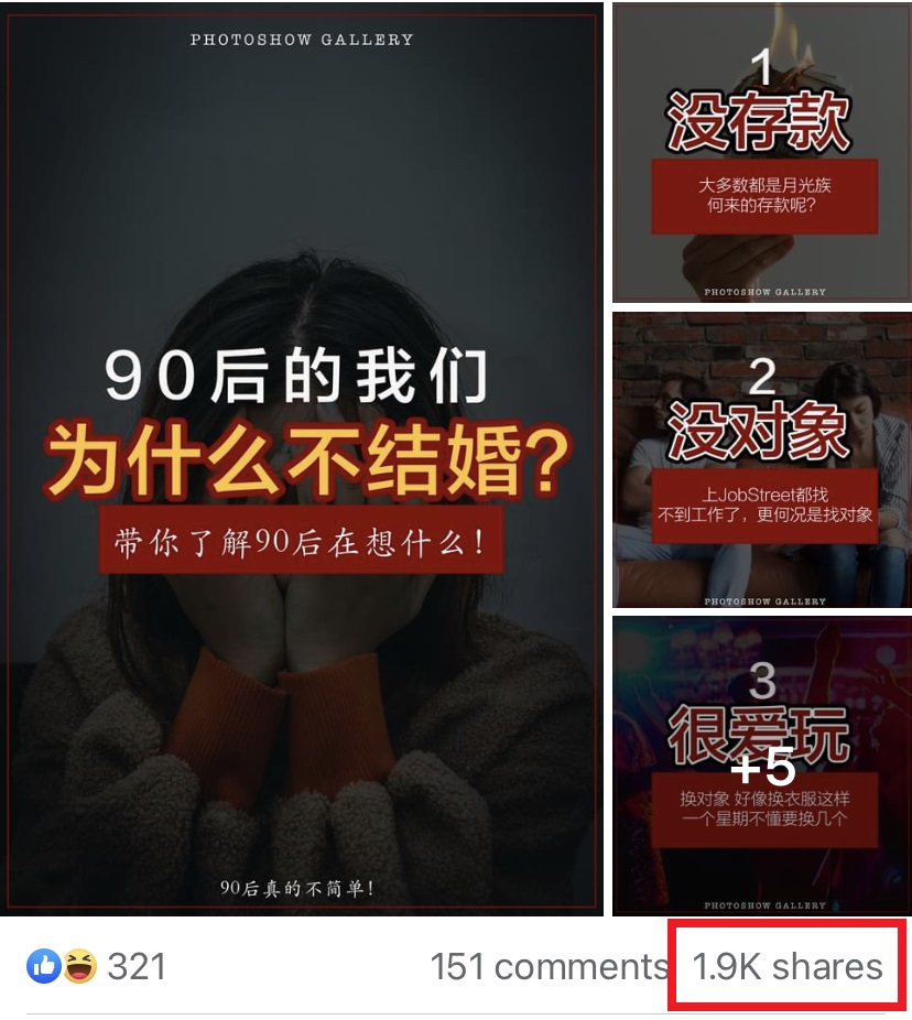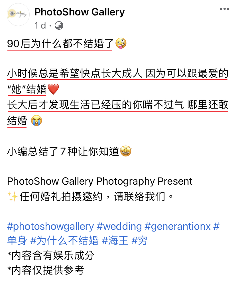 大马一家摄影公司的脸书专页,日前发了一则帖文引起网友们的关注和讨论,有关90后不结婚的7个原因。
