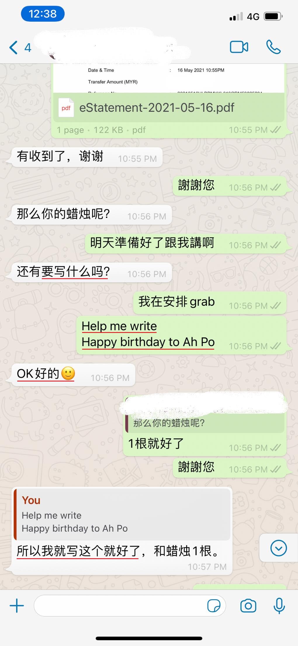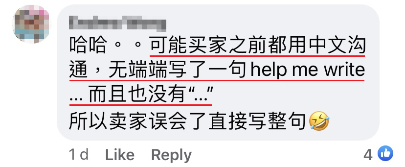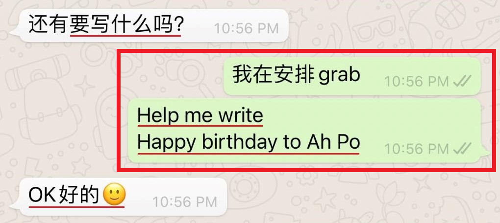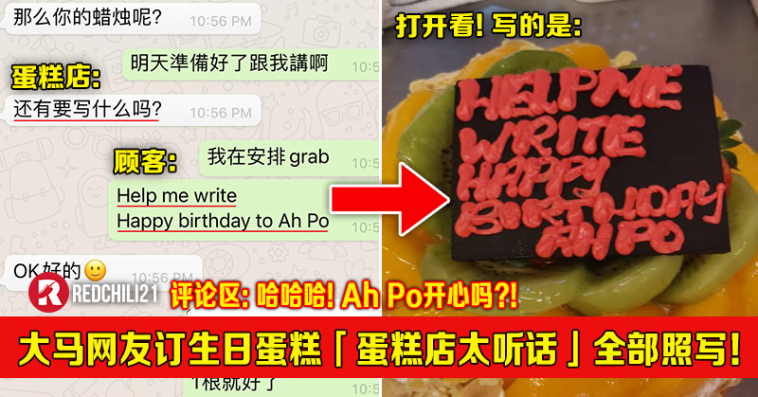 当客服问顾客要写什么字在蛋糕上面的时候,顾客回复的是:「Help me write Happy birthday to Ah Po」整个交谈过程都十分顺利,看似没有任何毛病。