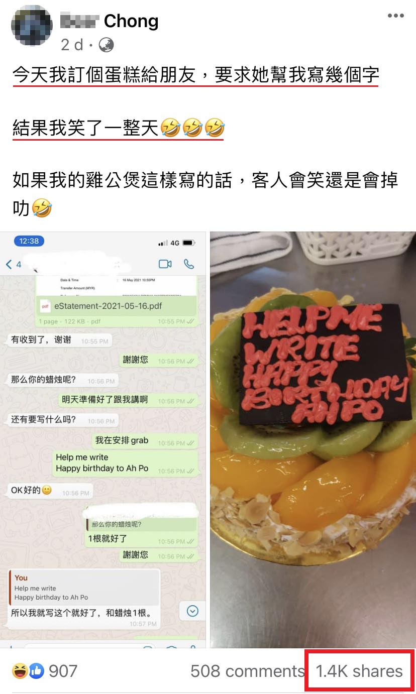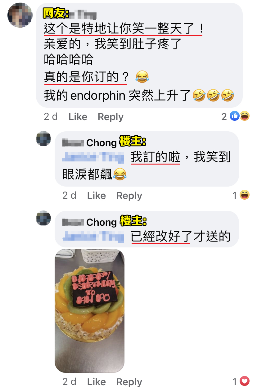 花钱订制生日蛋糕准备给寿星制造惊喜,结果收到蛋糕的时候发现整个“大翻车”,事主一定都会很生气,但这名大马网友却是笑到喷泪!