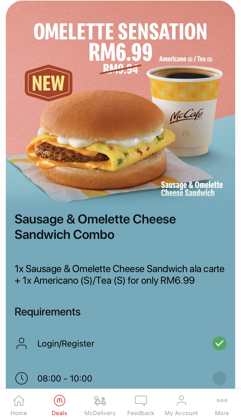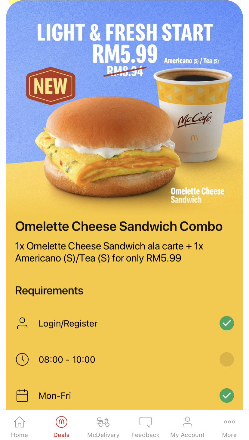 ▼ 即日起,通过麦当劳 App 还可享有更便宜的优惠价!原价 RM8.94 的 Omelette Cheese Sandwich Combo 现在只需 RM5.99!