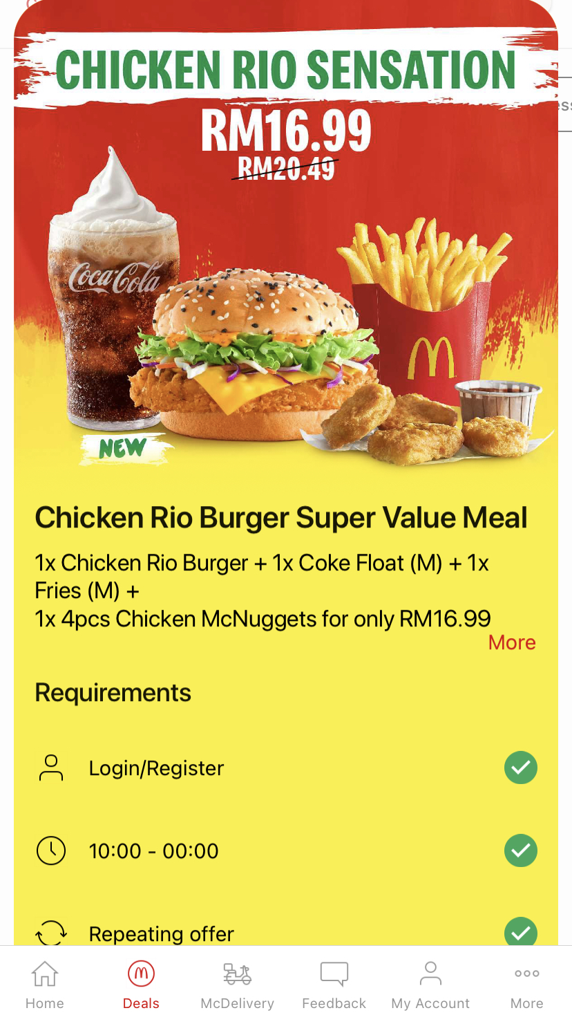 ▼ 即日起,通过麦当劳 App 还可享有更便宜的优惠价!原价 RM20.49 的 Chicken Rio Sensation 现在只需 RM16.99!
