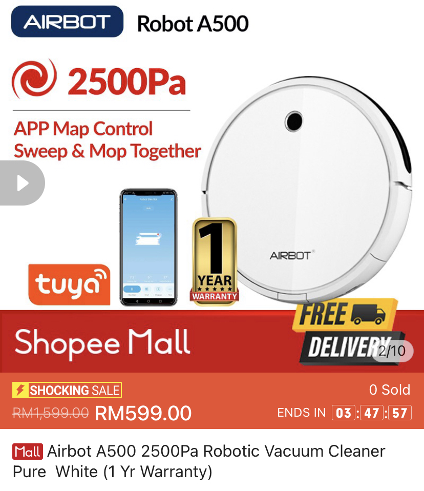 ▪ Airbot A500 Robotic Vacuum Cleaner Pure 2500Pa White 1 Year Warranty – 原价RM1599