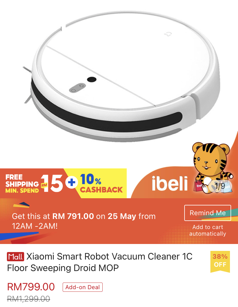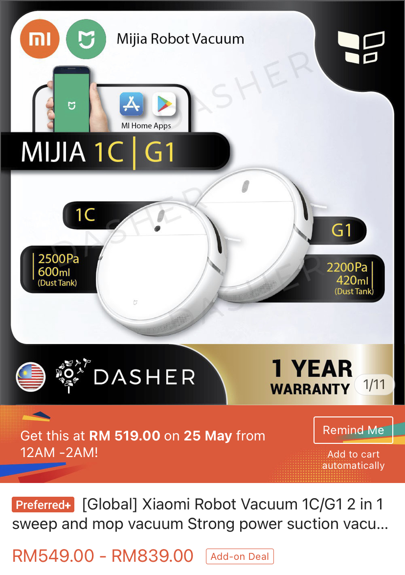 ▪ [Global] Xiaomi Robot Vacuum G1 2 in 1 sweep and mop vacuum Strong power suction vacuum – 原价RM549-RM839