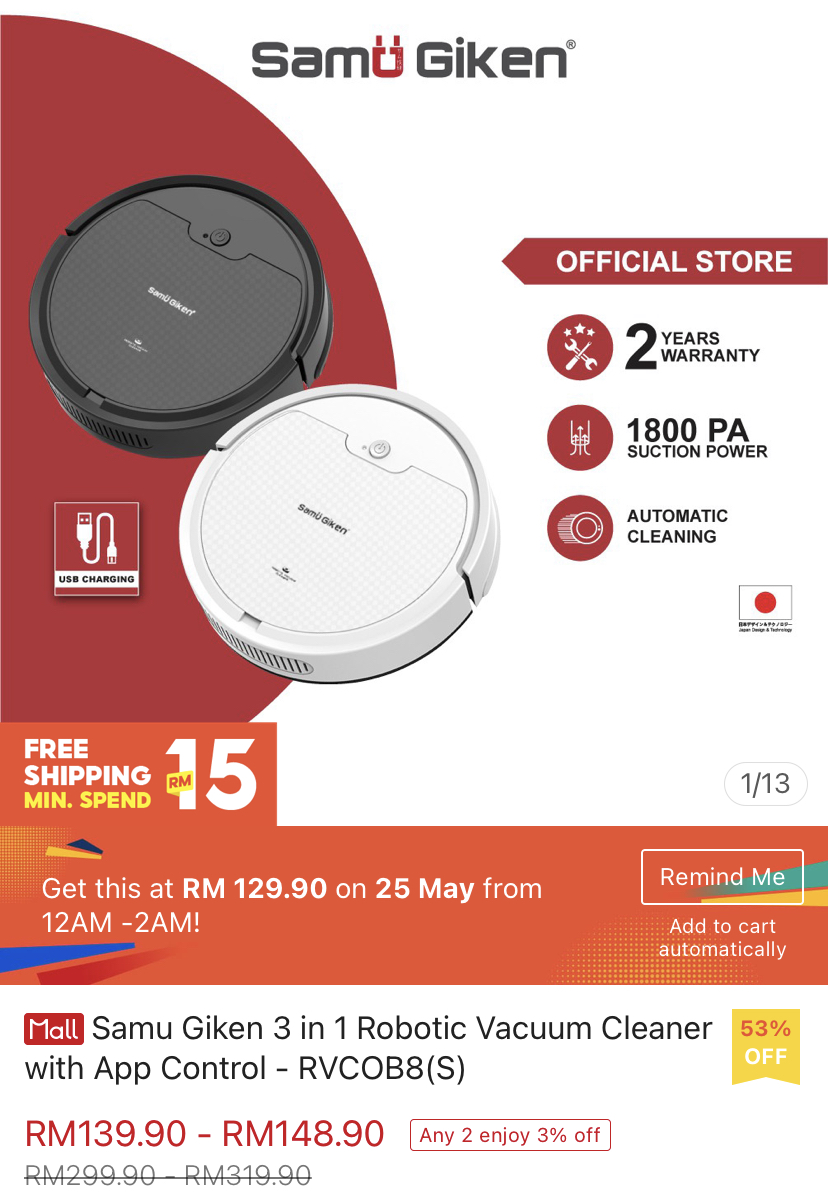 ▪ Samu Giken 3 in 1 Robotic Vacuum Cleaner with App Control – RVCOB8(S) – 原价RM229.90-RM319.90